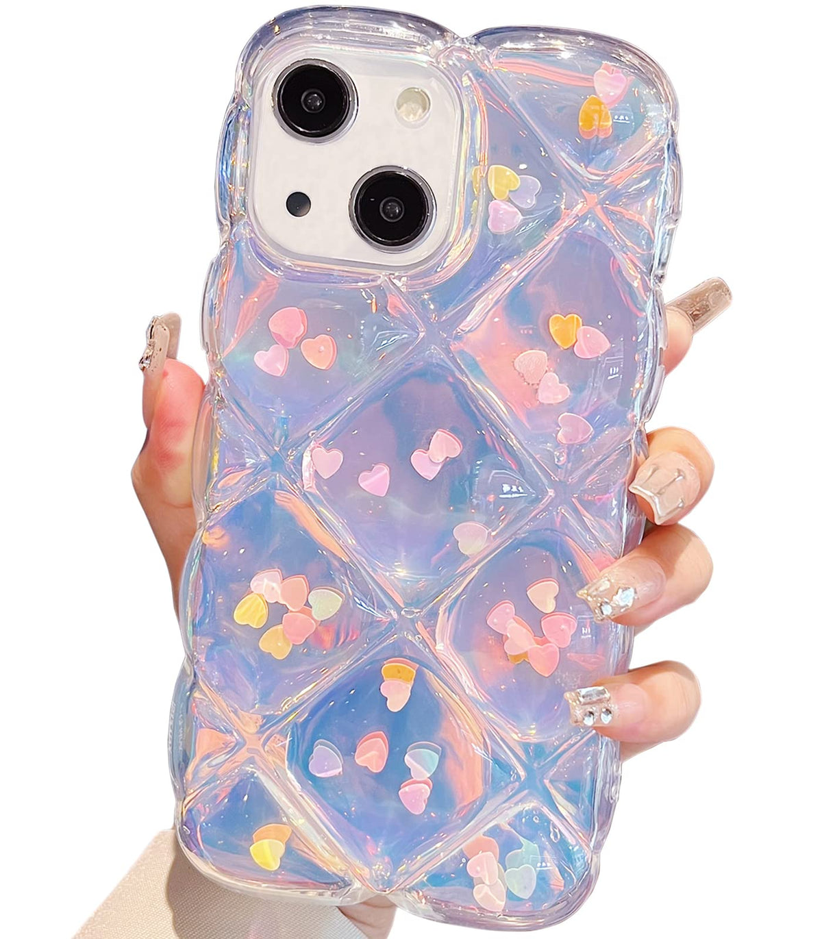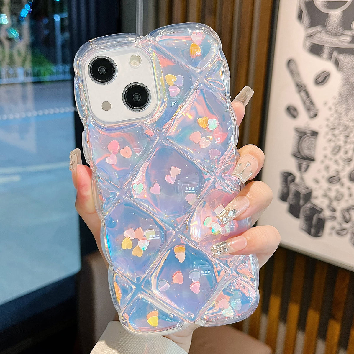 Q: What makes the Qokey iPhone 14 case different from other phone cases?A: The Qokey iPhone 14 case features a unique 3D laser design with a cute gradient effect and embedded love hearts, making it visually appealing. It also includes a soft wave frame for better grip and military-grade fall protection.