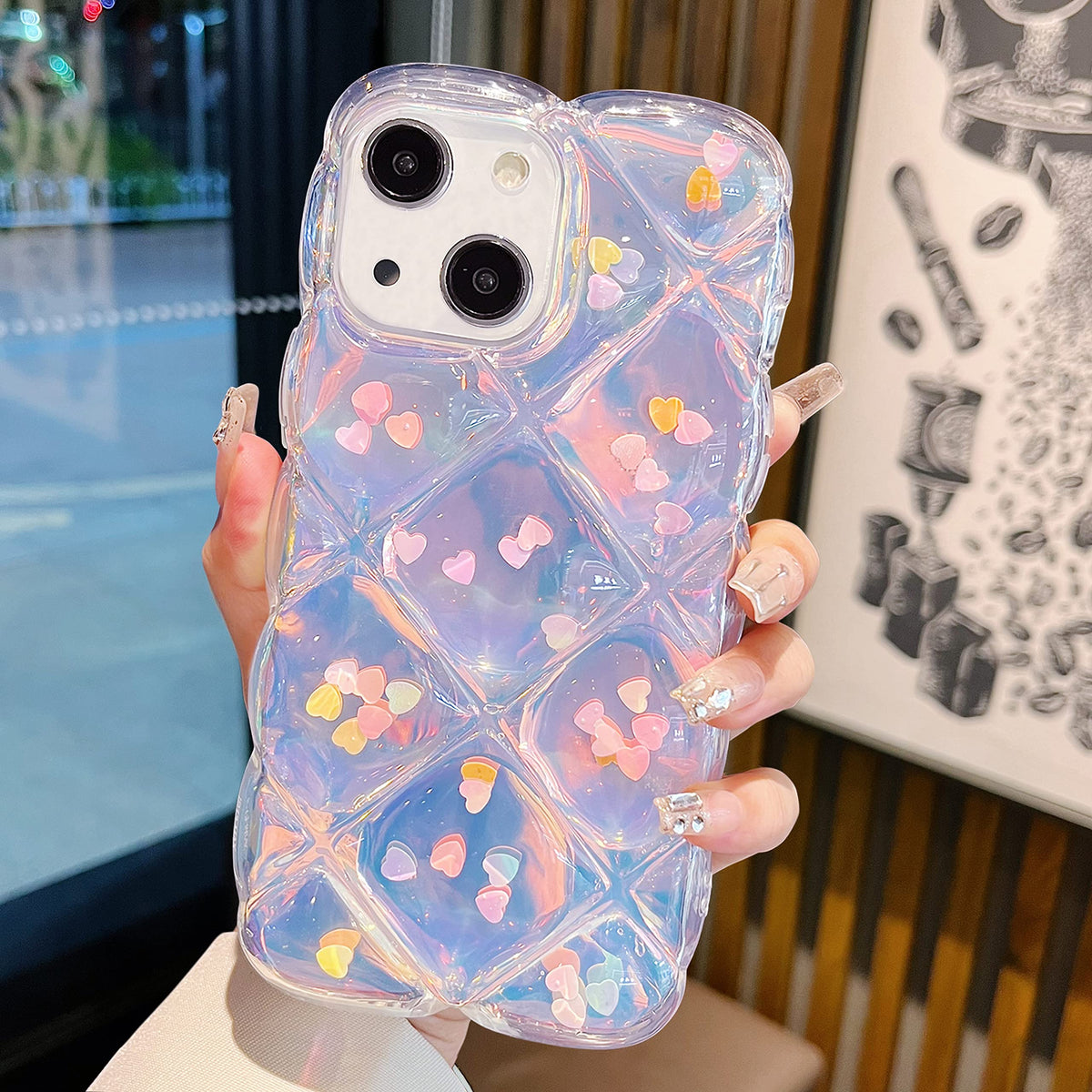 Qokey Compatible With Iphone 14 Case,Cute Laser Gradual Bling Love Heart Glitter Clear+Translucent Card Soft Wave Frame Anti Fal