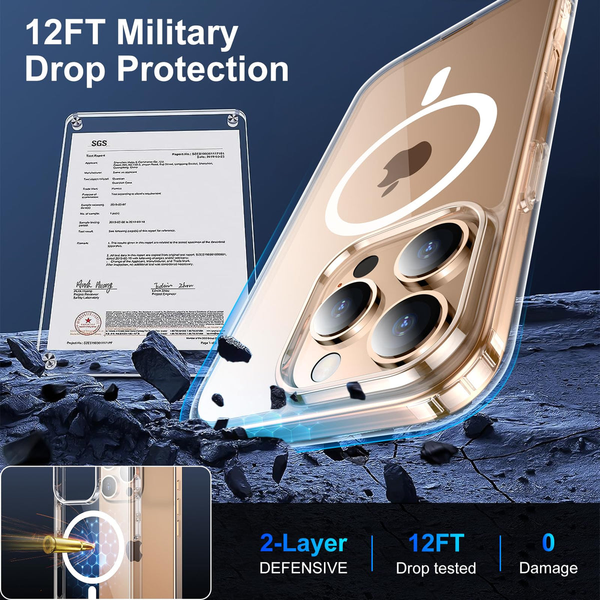 Q: How does the case protect my iPhone 16 Pro Max from drops?A: The case offers military-grade shockproof protection, having been drop tested over 3000 times to withstand falls from up to 12 feet. It uses shock-absorbing materials and features raised bezels to protect the camera and screen from scratches and impacts.