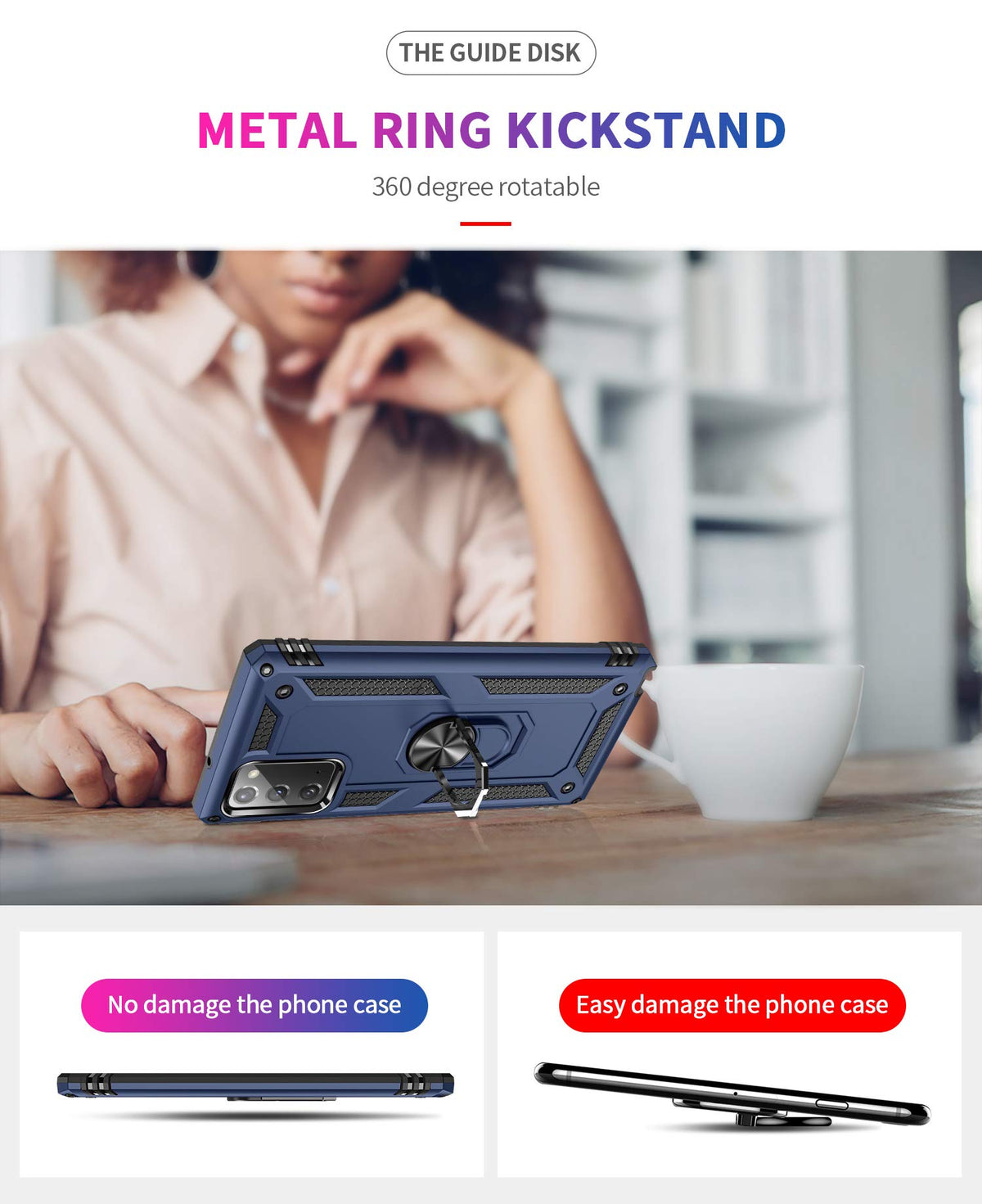Androgate Super Ring Series Military Grade Phone Case For Samsung Galaxy Note 20 Galaxy Note 20 5G This Is A Dual Layer Designed Case But It Is Extremely Compact And Sleek The Integrated Metal Ring Which Can Be 360A Rotatable Works Pefectly As A Holer Or A Stand Whats More, The Metal Plate For Holding The Ring Can Attach Easily To Your Magnetic Car Mount Or Holder When You Drive Enjoy Your Hands-Free Moments To Watch A Video Or Facetime With The Androgate Super Ring Series Case Frequently Asked Questions: Question 1: Will It Be Bulky In Hands Since It Is A Dual Layer Caseanswer: No, It Wont Be Bulky At All Due To The Compact Design And It Adds Minimum Weight To Your Phone Question 2: Does It Support Wireless Charginganswer: No, It Does Not Allow For Wiress Charging You Have To Remove The Case Before Placing Onto Your Wireless Charger Question 3: Does The Case Come With Screen Protectors Answer: Yes, We Make Sure Every Package Comes With 2Pcs High Quality Hd Pet Screen Protectors Question 4: Can The Ring Stand Work Both Horizontally And Vertically Answer: Yes, It Can Horizontally, The Mounting Angle Is About 70A And It Is Perfect For Nearly All People Vertically, It Can Only Mount At About 35A Above The Level, Which Is Fine For Most People But Others May Find It A Little Bit Low It Is A Matter Of Optionsrisk Free Guaranteedwe Are So Confident With The Quality Of Our Products That All The Androgate Phone Cases Are Backed With A 100 Money Back Guarantee And A 60-Day Warranty