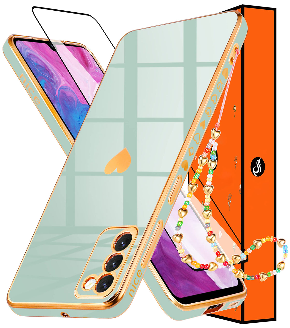 Q: What accessories come with the phone case?A: The Shorogyt 3in1 Heart Case includes a screen protector and a gold hearts charm chain, providing additional protection and a stylish touch to your phone.
