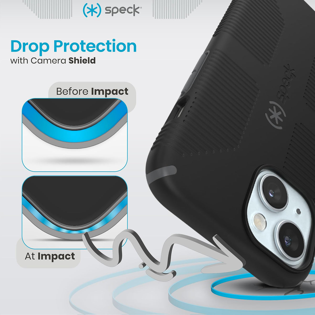 Q: What level of drop protection does the Speck iPhone 15 case provide?A: The Speck iPhone 15 case offers exceptional drop protection, engineered to withstand drops from heights of up to 8 feet, ensuring your device remains safe during life's rough moments.