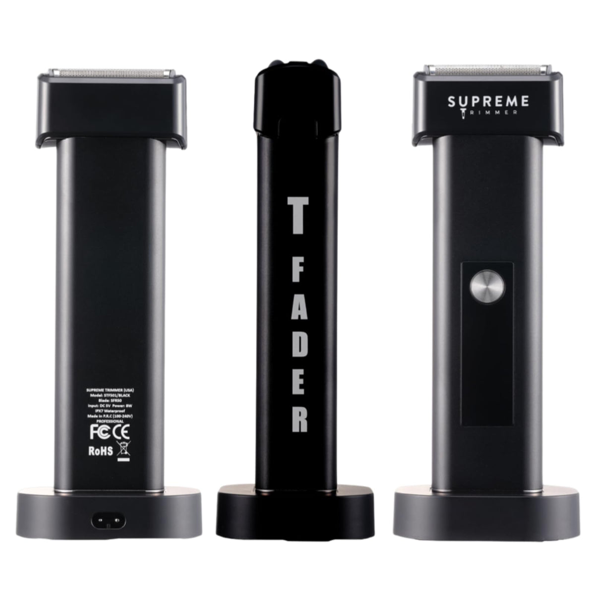 Q: What accessories are included with the Supreme Trimmer T-Fader Foil Shaver?A: The package includes the T-Fader Li, a charging stand, a cleaning brush, oil, a 1.5M extra long USB cable, and a foil guard, providing everything you need for a complete shaving experience.
