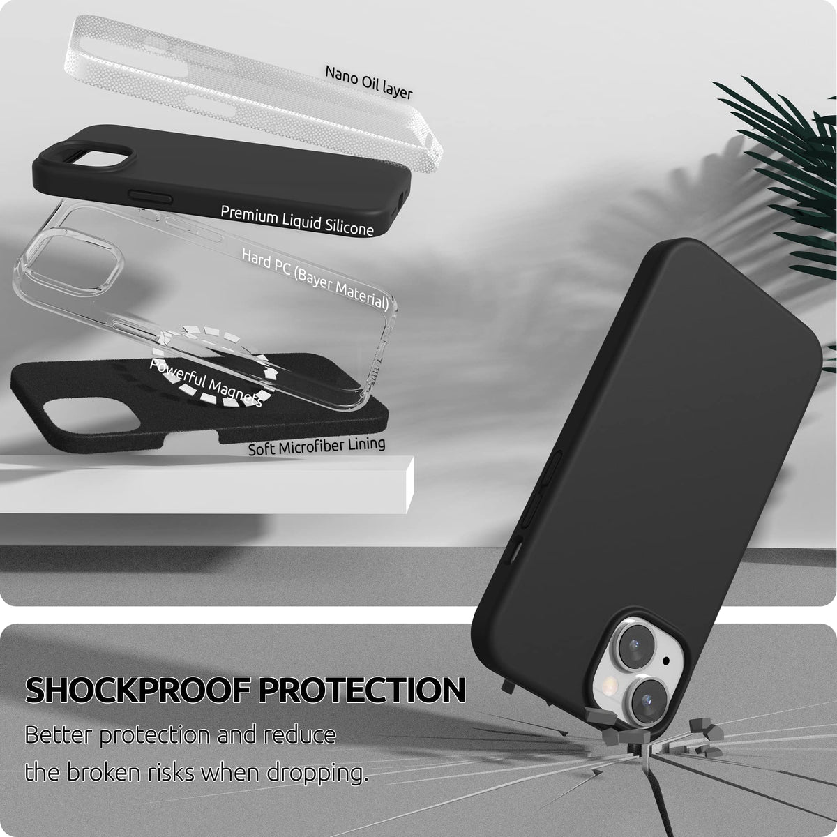 Q: What material is the SURPHY iPhone 14 case made of?A: The case is made of premium liquid silicone, which offers a smooth touch, comfortable grip, and is designed to resist fingerprints while providing a soft, anti-skid microfiber lining for added protection.