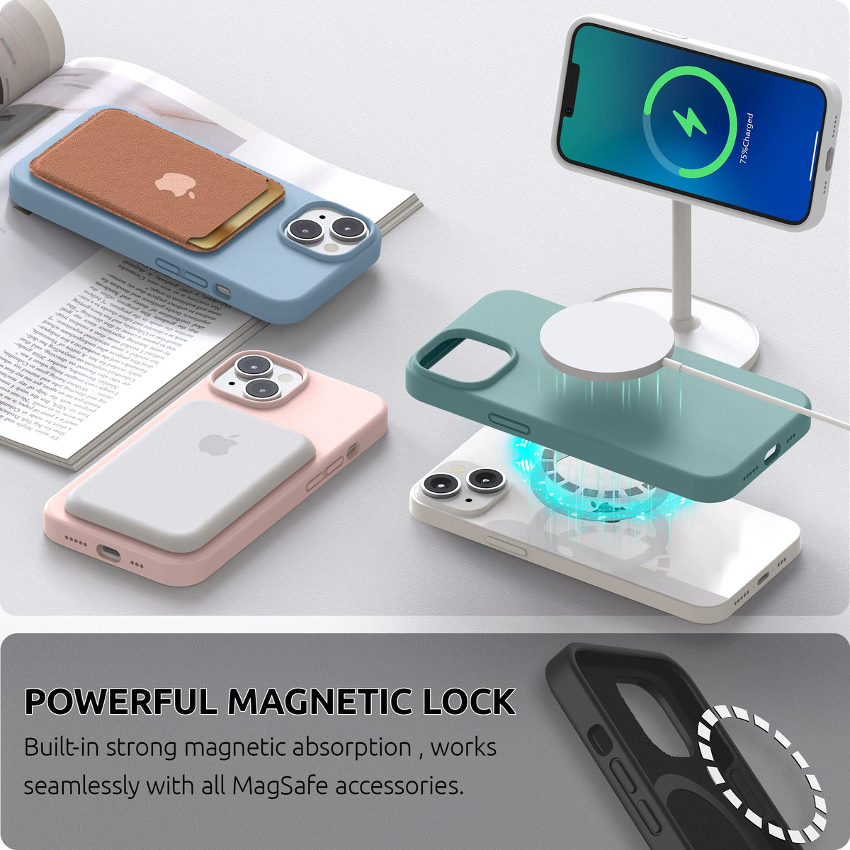 Q: How does the magnetic feature of the SURPHY iPhone 14 case work?A: The case is built with 38 magnetic blocks that enhance the magnetic force and suction effect, ensuring a stable connection with MagSafe chargers for fast and reliable charging.
