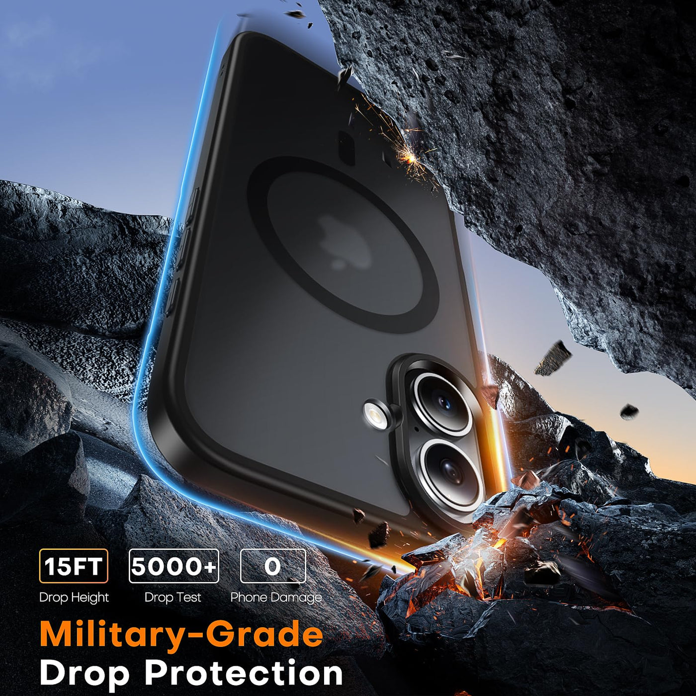 Q: What type of protection does this case offer for my iPhone 16 Plus?A: This case provides military-grade protection, featuring a combination of a soft frame and a hard PC back cover with built-in corner airbags to absorb impact from drops and bumps.