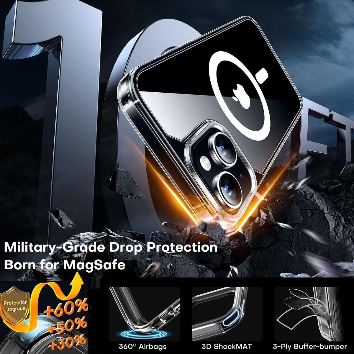 Q: What kind of protection does this case offer for my iPhone 13?A: This case provides 3-in-1 360° full protection, including military-grade protection with certified drop test standards. It features built-in corner airbags to absorb impact from accidental drops.