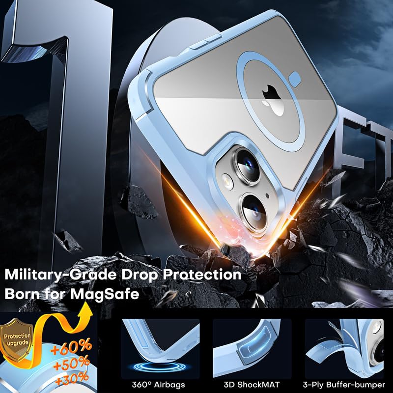 Q: What type of protection does this case provide for my iPhone 15?A: The TAURI case offers military-grade protection, combining a soft-frame and a hard PC back cover with four built-in corner airbags to absorb impact and prevent damage from accidental drops, bumps, and scratches.