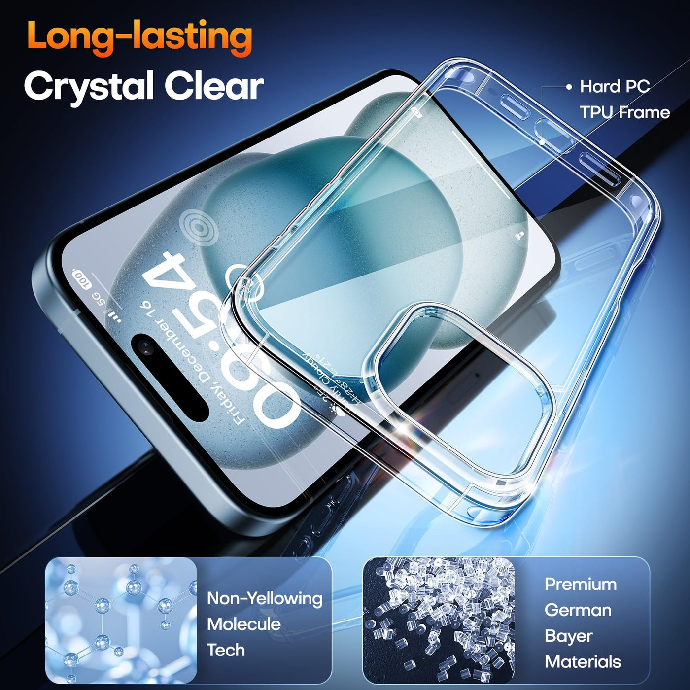 Q: Will this clear case yellow over time?A: No, the TAURI for iPhone 15 Case is made with high-grade German Bayer ultra-clear TPU material and features a nano antioxidant layer that resists stains and sweat, preventing greasiness and yellowing over time.