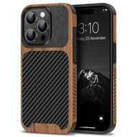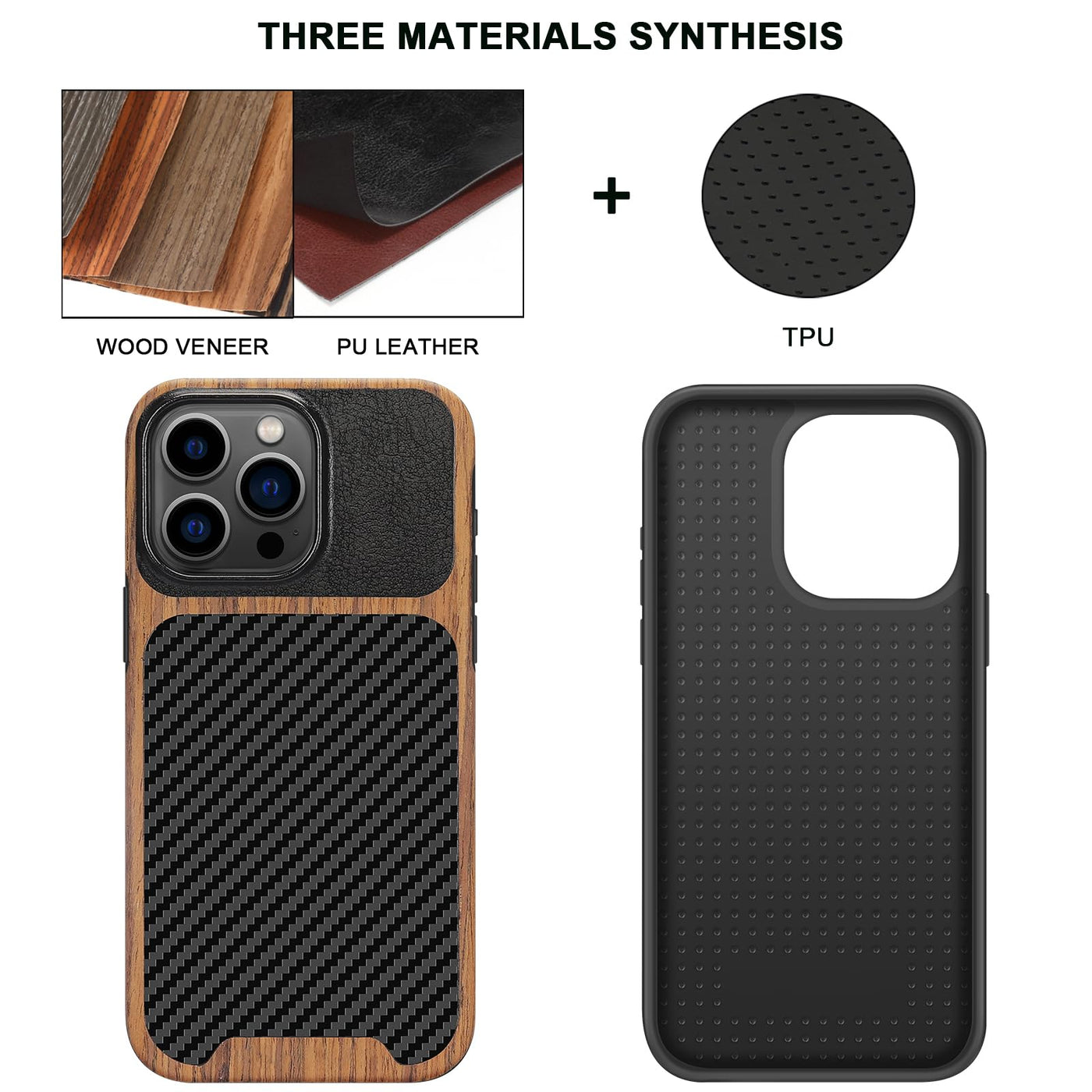 Tendlin Compatible With Iphone 15 Pro Case Wood Grain With Carbon Fiber Texture Design Leather Hybrid Slim Case (Black)