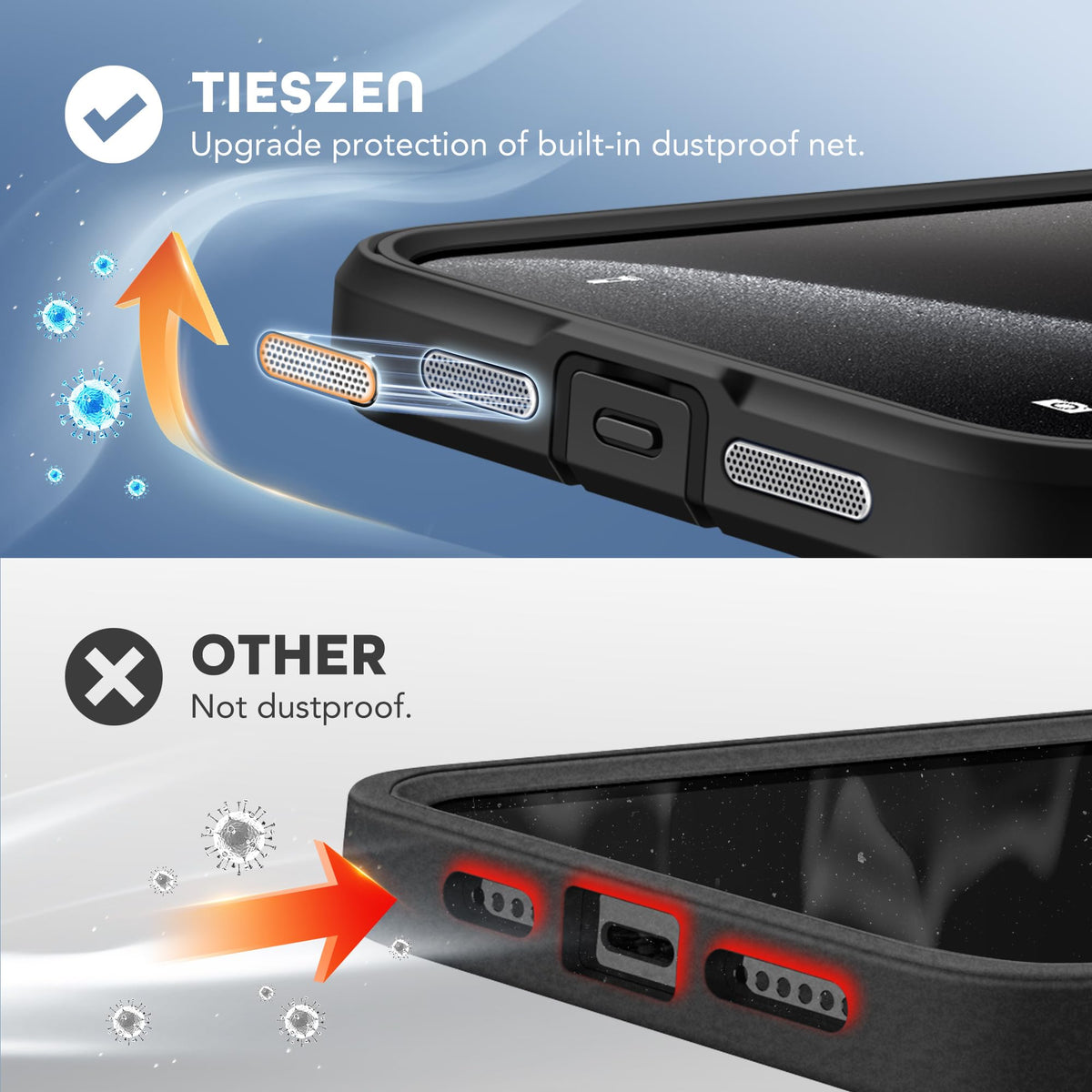 Q: How do I clean and maintain the TIESZEN Magnetic case?A: To clean the TIESZEN Magnetic case, gently wipe it with a soft, damp cloth. Avoid using harsh chemicals that could damage the case. Regularly check the dust-proof covers to ensure they are functioning properly to keep your phone clean.