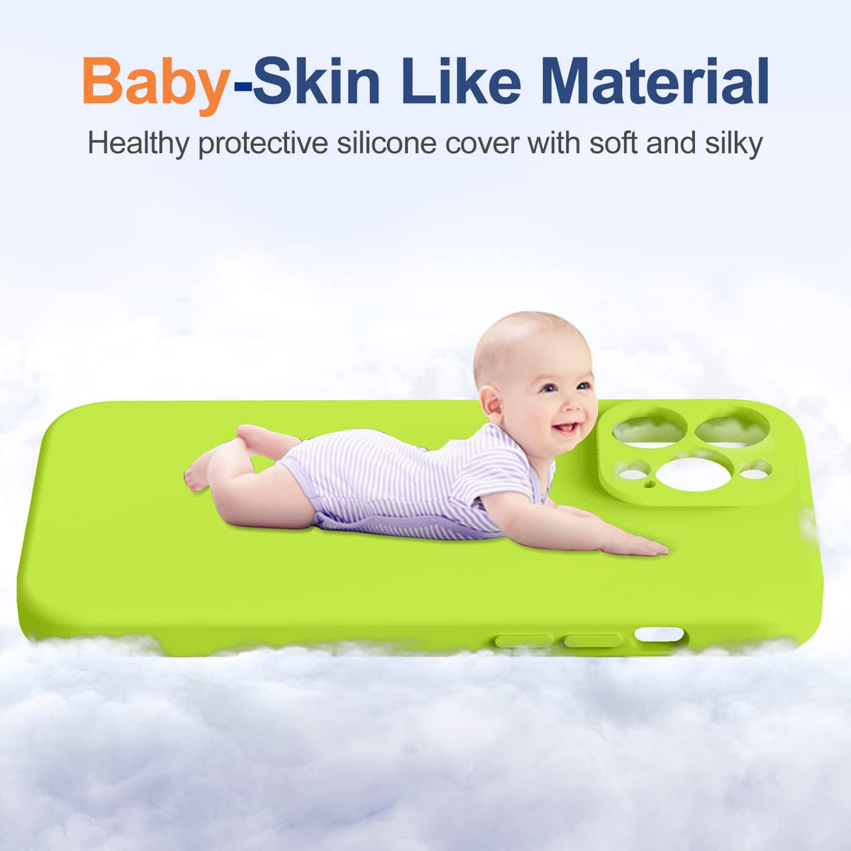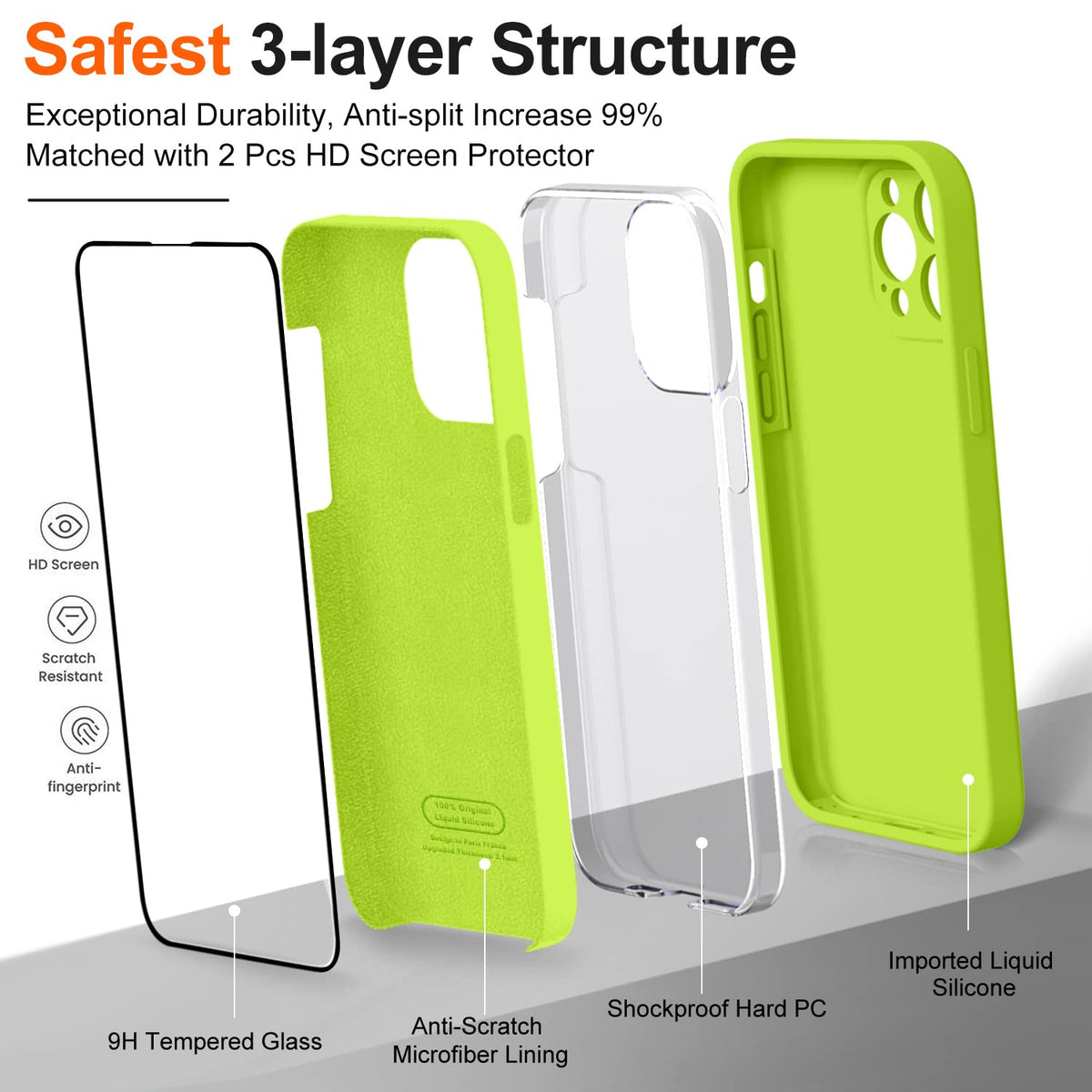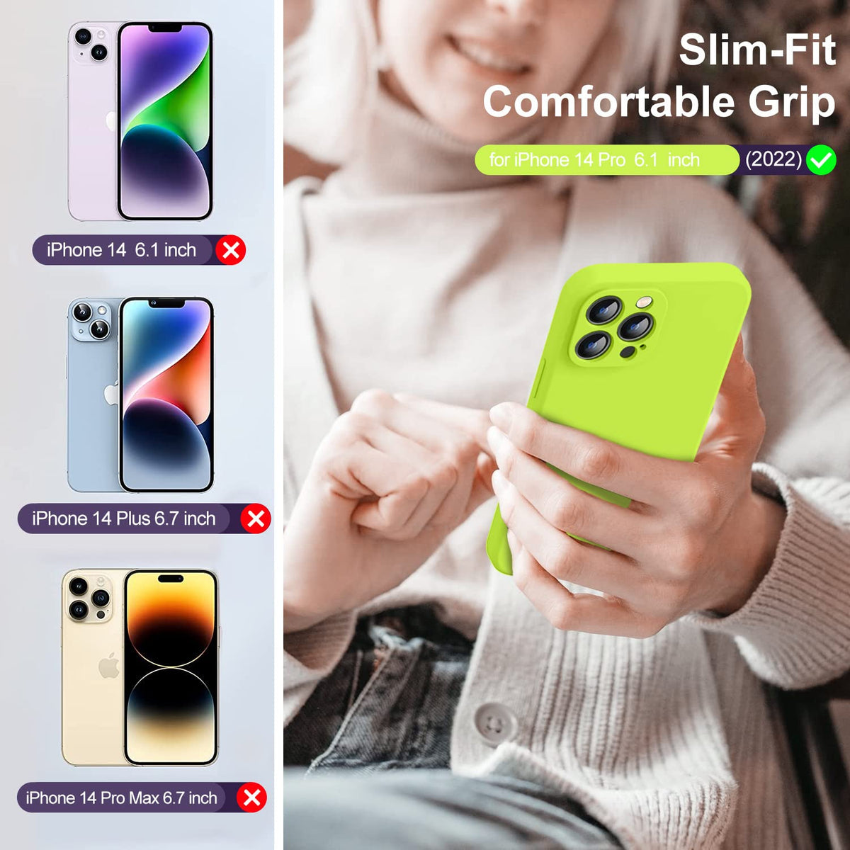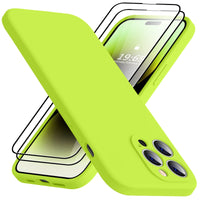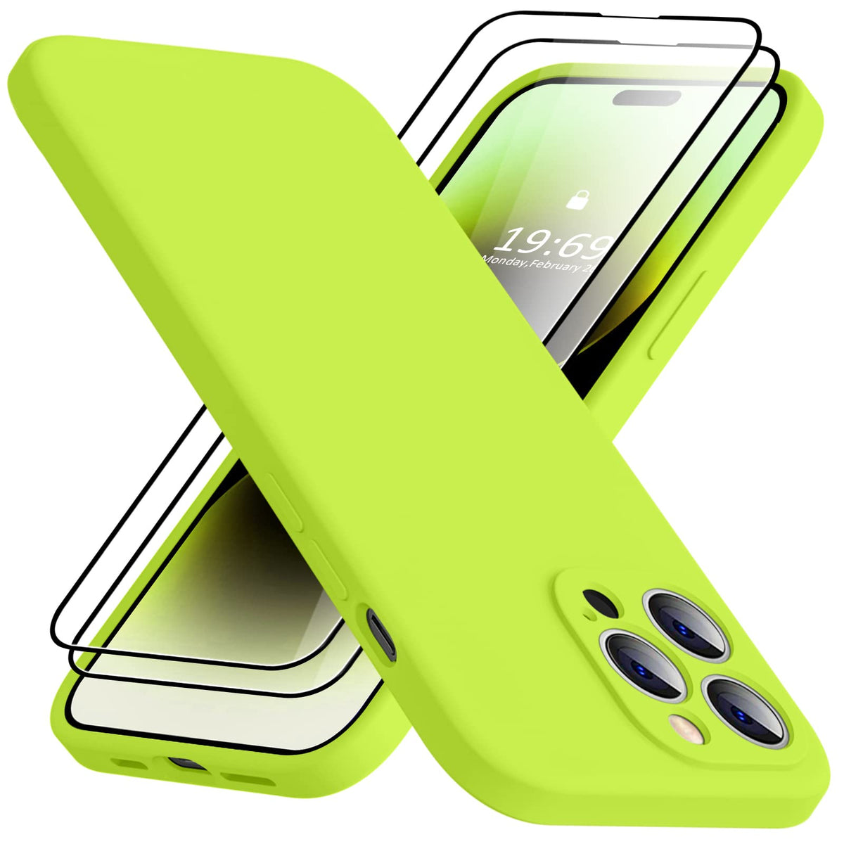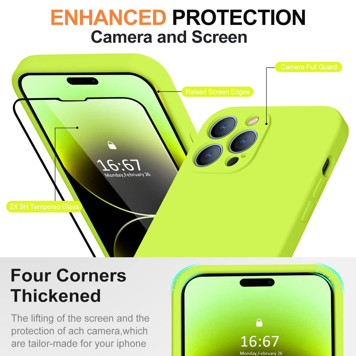 Tisoog Compatible With Iphone 14 Pro Case, With 2 Pcs 9H Tempered Glass Screen Protector, Camera Protection]Microfiber Lining] Shockproof Slim Silicone Case For Iphone 14 Pro, Fluorescent Green