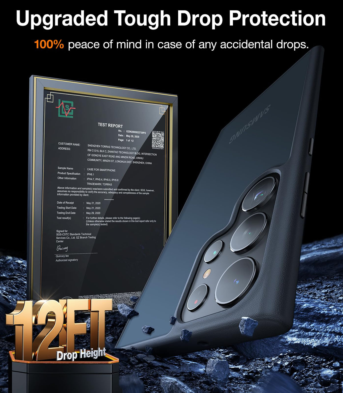 Q: What level of protection does this case provide?A: The TORRAS Shockproof case offers military-grade drop protection, safeguarding your Galaxy S24 Ultra against accidental drops from heights up to 12 feet, along with all-around airbag protection.