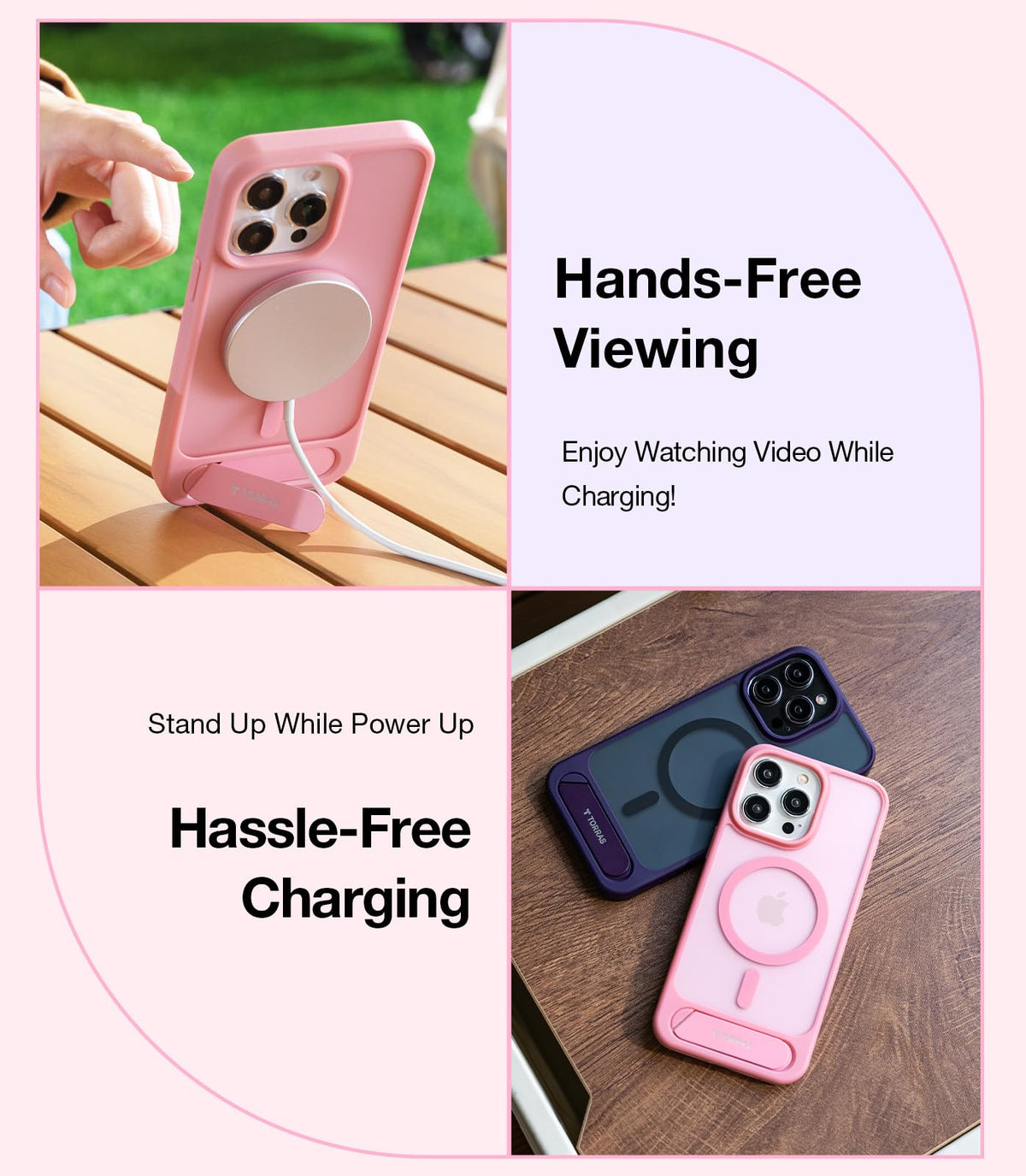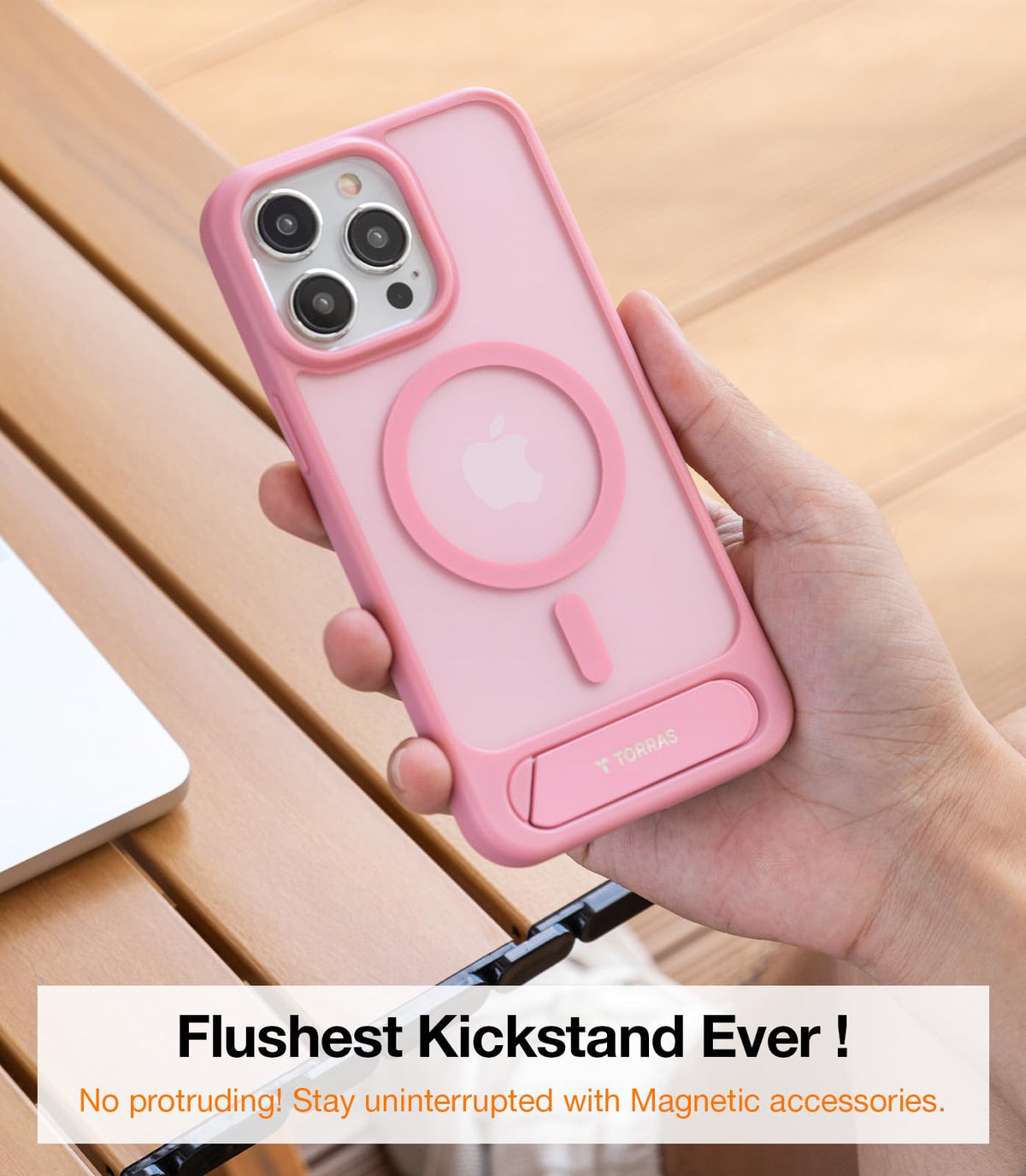 Q: How does the kickstand feature work on this phone case?A: The case features a uniquely designed flush kickstand that allows for hands-free viewing at angles of 55° vertically and 65° horizontally. It remains unobtrusive when not in use, ensuring that magnetic charging is uninterrupted.