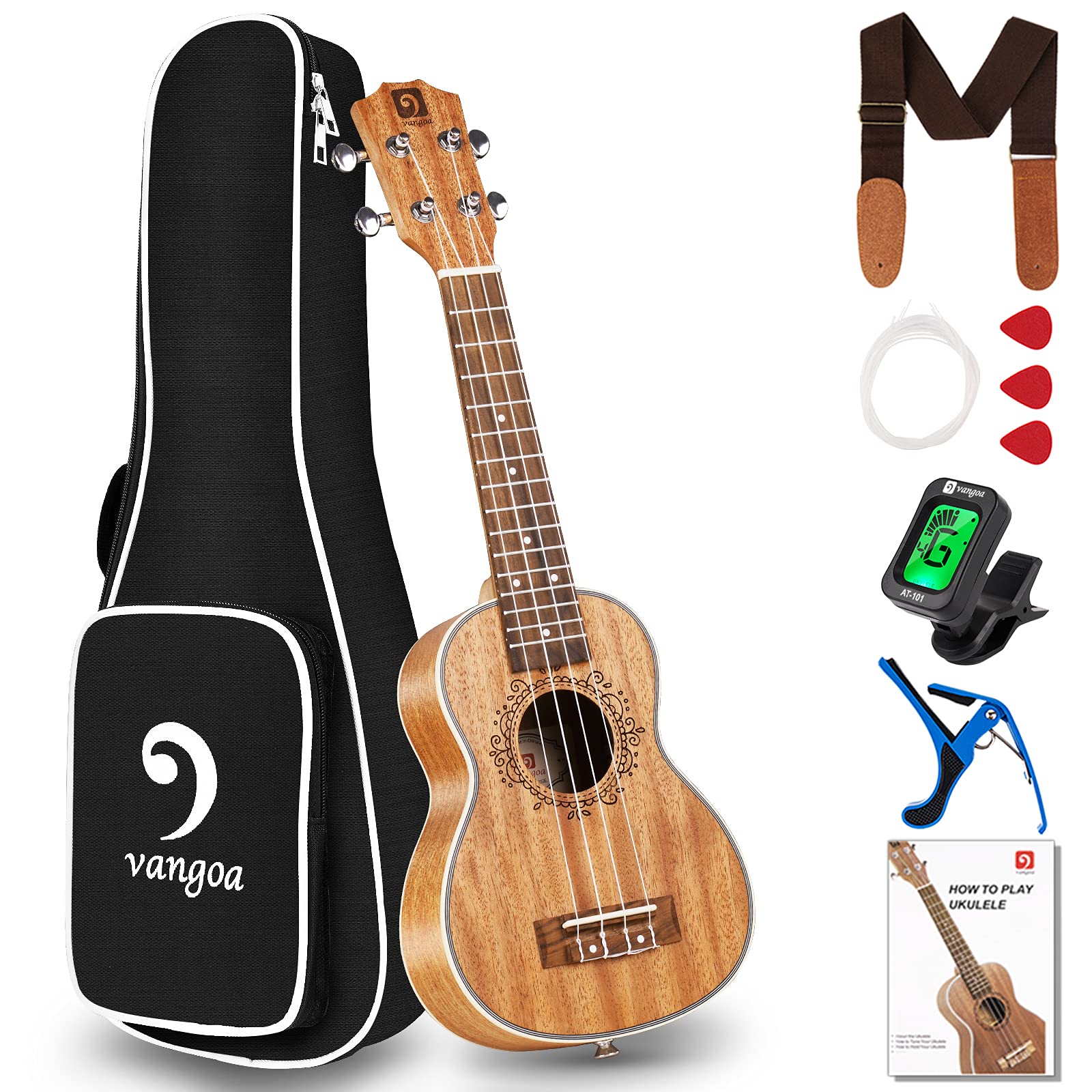 Vangoa Soprano Ukulele Mahogany 21 Inch Acoustic Ukelele Uke Beginner Kit For Kids Students Starter With Guide Book Features 1 Bright Crisp Sound: Made Of Selected Aaa Mahogany, The Soprano Ukulele Produces Bright, Crisp And Rich Sound The Arched Back Design Strengthens The Resonance, Making It Sound Richer, Brighter And Warmer With Longer Sustain 2 Comfortable: Modern C Shape Neck With A Shallow Flattened Oval Sports An Ultra-Comfortable Contour For A Smoother & Easier Practice A Smooth Fretboard With Neat Fret Wire Provides A Comfortable Playability Low Action Design Deducts String Pressure, Pressing Feels Very Comfortable Under The Fingers, Thus Pretty Suited For Beginners 3 Easy To Learn : Get Started With The 21 Inch Ukulele With Vangoa Ukulele Beginner Guide Book, Which Is Easy To Understand The Ukulele Bundle Is A Great Ukelele Kit For Kids, Children, Beginners, Students, Adults Or Professionals 4 Easy To Tune & Keep In Tune: Anti-Dust Chromed Plated Fully Closed Tuning Pegs Guarantee Accurate Tuning And Keep The Ukulele Always In Tune High Quality Smooth Nylon Strings For Easy Installation And Enhanced Tuning Stability Digital Clip-On Tuner Make Sure That You Can Tune The Ukulele Easily Whenever And Wherever You Want 5 All In One: The Soprano Ukulele Starter Kit Includes Soprano Ukulele, Gig Bag, Tuner, Extra Strings, Fast Learn Book, 3 Picks, Capo And Adjustable Strap It Comes With Everything You Need High Quality Padded Gig Bag Features 2 Padded Shoulder Strap And Exterior Large Pocket For Easy Carrying And Well Protection A Decent Gift For Birthday, Christmas, Thanksgiving, Childrens Day, Etc Package Included: 1 X Soprano Ukulele 1 X Lined Fabric Gig Bag 1 X Clip-On Handy Digital Tuner 1 X Ukulele Strap 1 X Set Of Ukulele Strings 3 X Ukulele Picks 1 X User Manual 1 X Ukulele Capo
