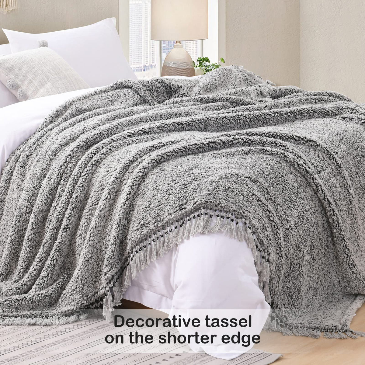 Ultra Soft Fleece Sherpa Blanket King Size,Lightweight Cozy Boho Bed Blanket With Decorative Tassel, Pattern Reversible, 2 Tones