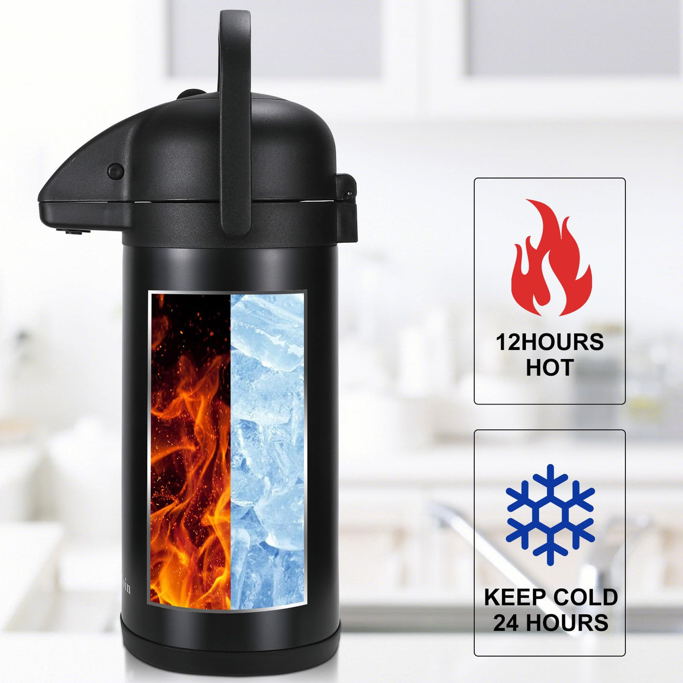 Q: How long does the Airpot Coffee Dispenser keep beverages hot or cold?A: The Updated Airpot Coffee Dispenser is designed to keep beverages hot for up to 12 hours and cold for up to 24 hours, thanks to its double-wall vacuum insulated technology.