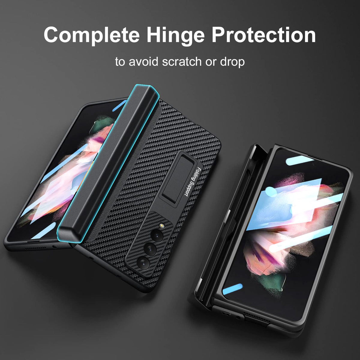 Q: What kind of protection does the case offer for the hinge?A: The case provides full hinge protection with a design that includes built-in magnets, ensuring the hinge remains secure and protected from damage.