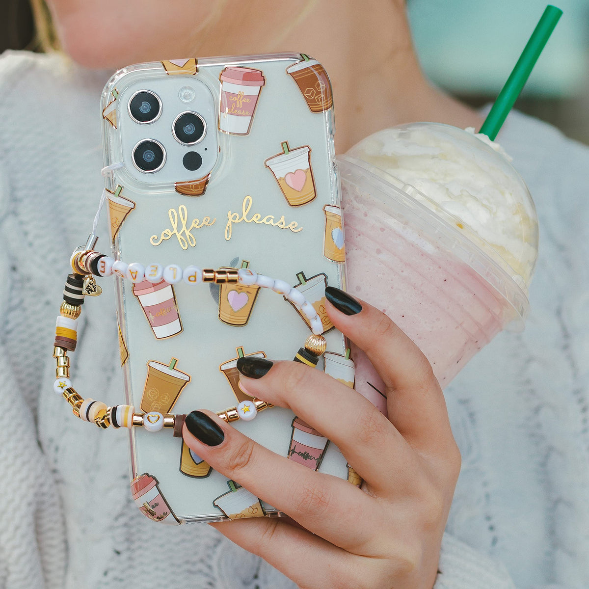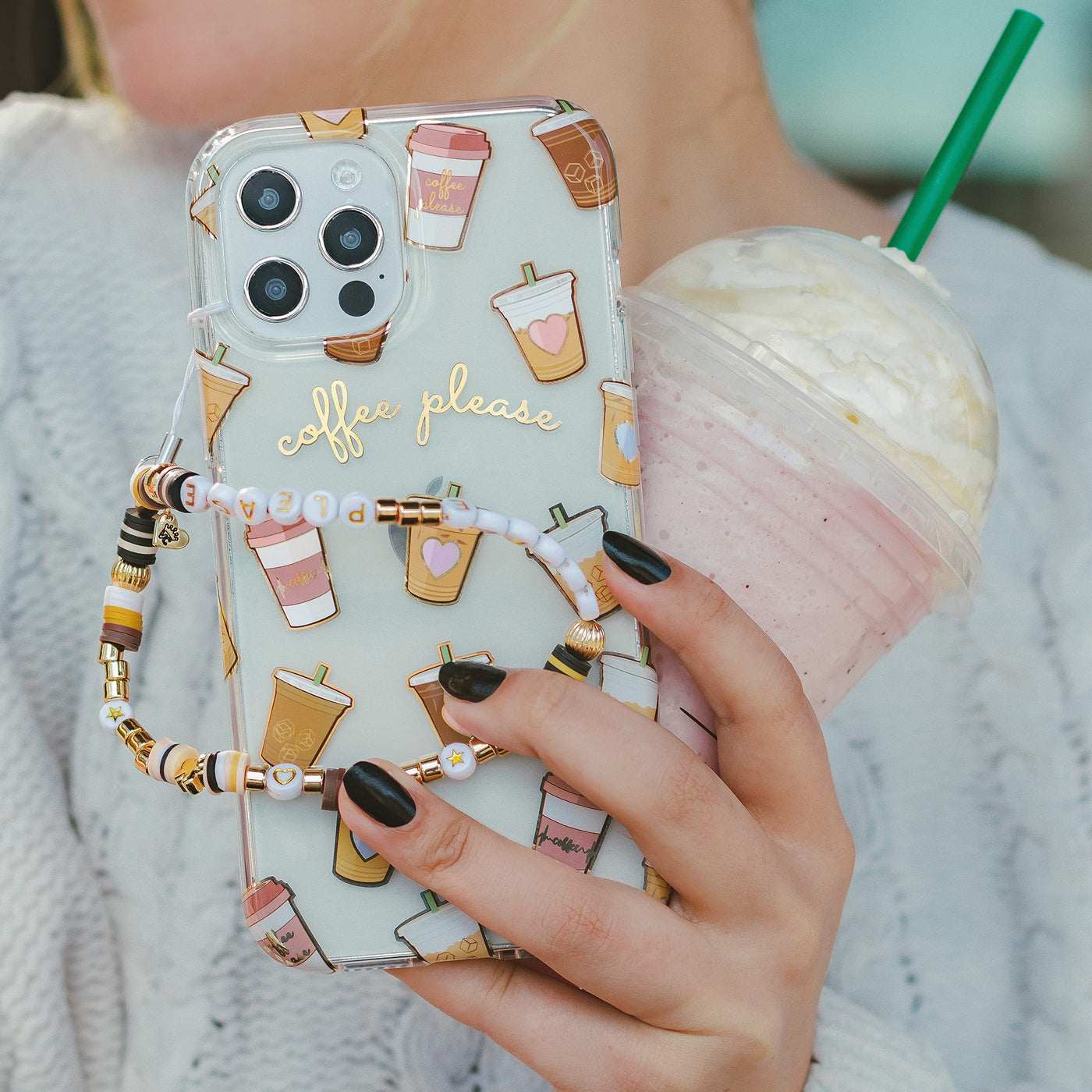 Mondays Canat Bring You Down When Youave Got Cups Of Coffee This Protective, Clear Case Has A Super Cute Coffee Pattern Featuring Iced Coffee And To-Go Cups It Comes In A Gloss Finish, Gold Chrome Outlines, And A Matching Clear Bumper For Added Protection Against Drops