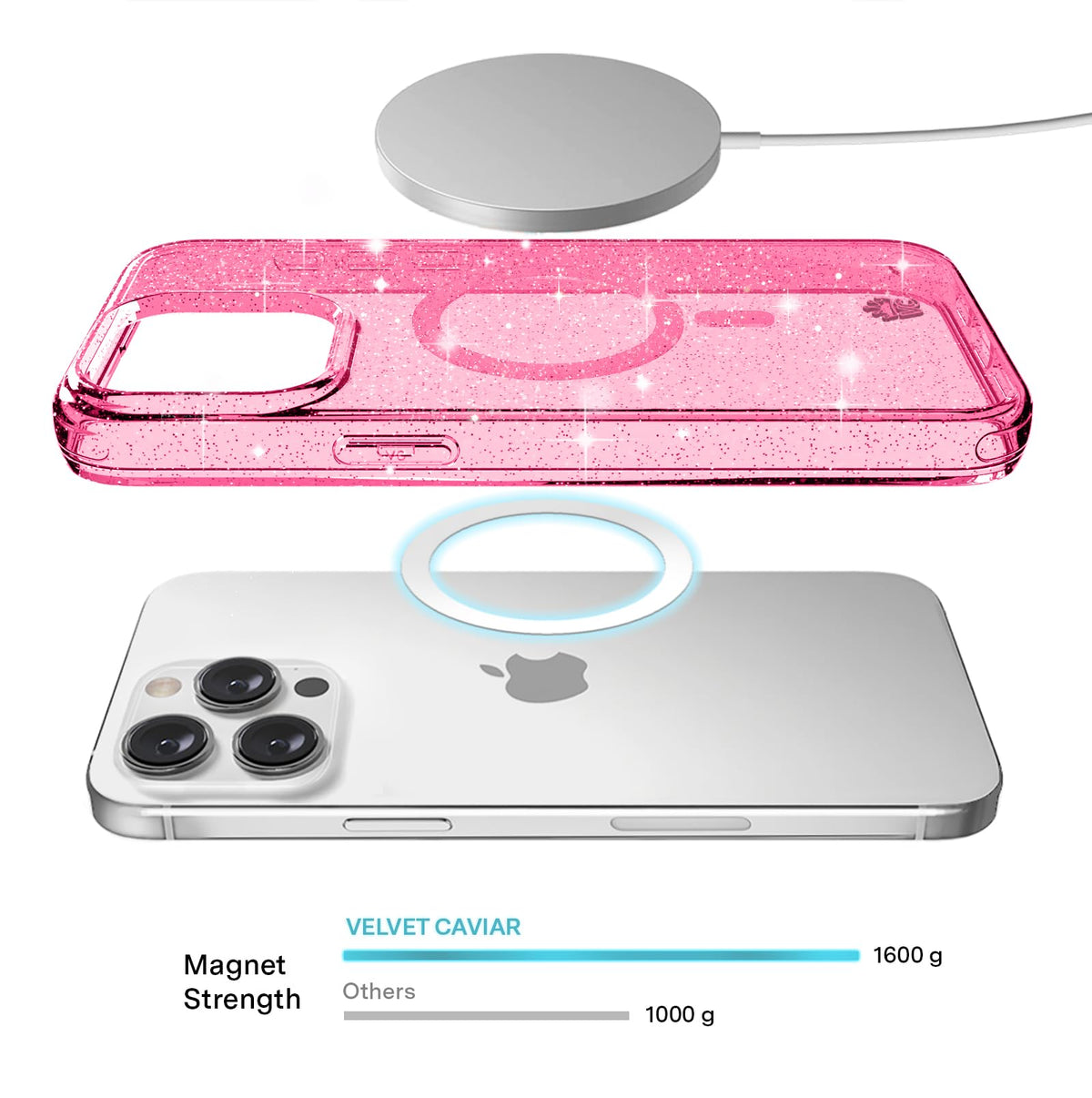 Q: How should I care for the Velvet Caviar case to maintain its appearance?A: To maintain the appearance of your Velvet Caviar case, clean it regularly with a soft, damp cloth. Avoid harsh chemicals or abrasive materials that could damage the glitter finish.