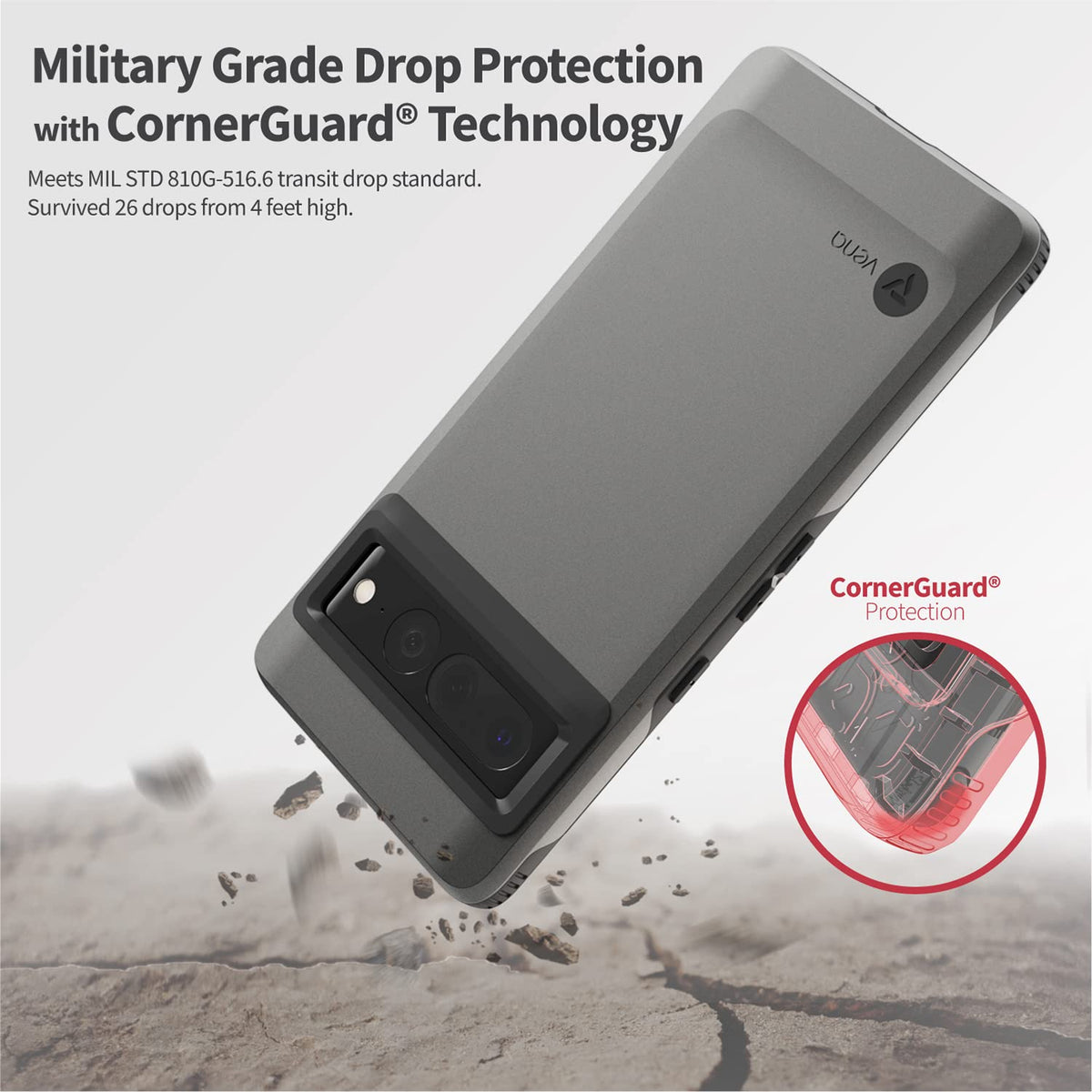Q: What makes the VENA Outcross case for Google Pixel 7 Pro stand out in terms of protection?A: The VENA Outcross case features military-grade drop protection with CornerGuard® technology, which effectively disperses shock and impact. It has been drop-tested to meet MIL-STD 810G-516.6 standards, surviving 26 drops from 4 feet high.