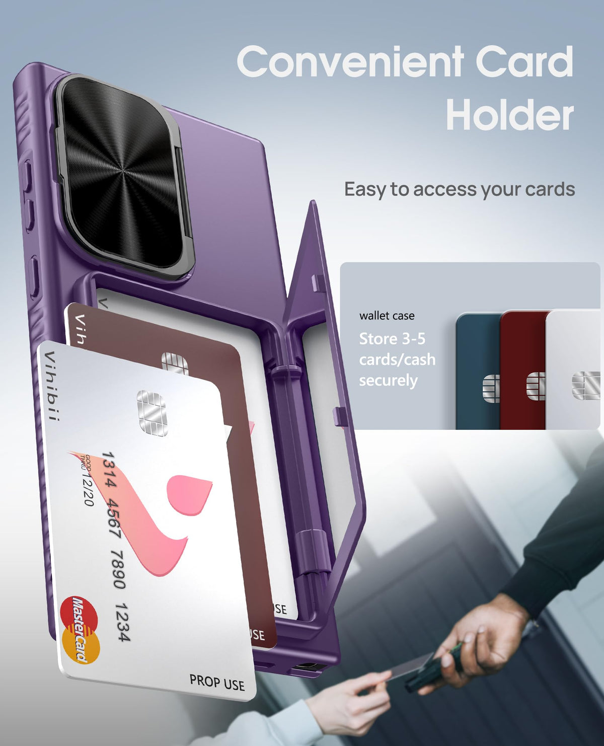 Vihibii For Samsung Galaxy S24 Ultra Case With Card Holder (4 Cards) & Kickstand & Camera Lens Cover, Heavy Duty Hard Back Soft