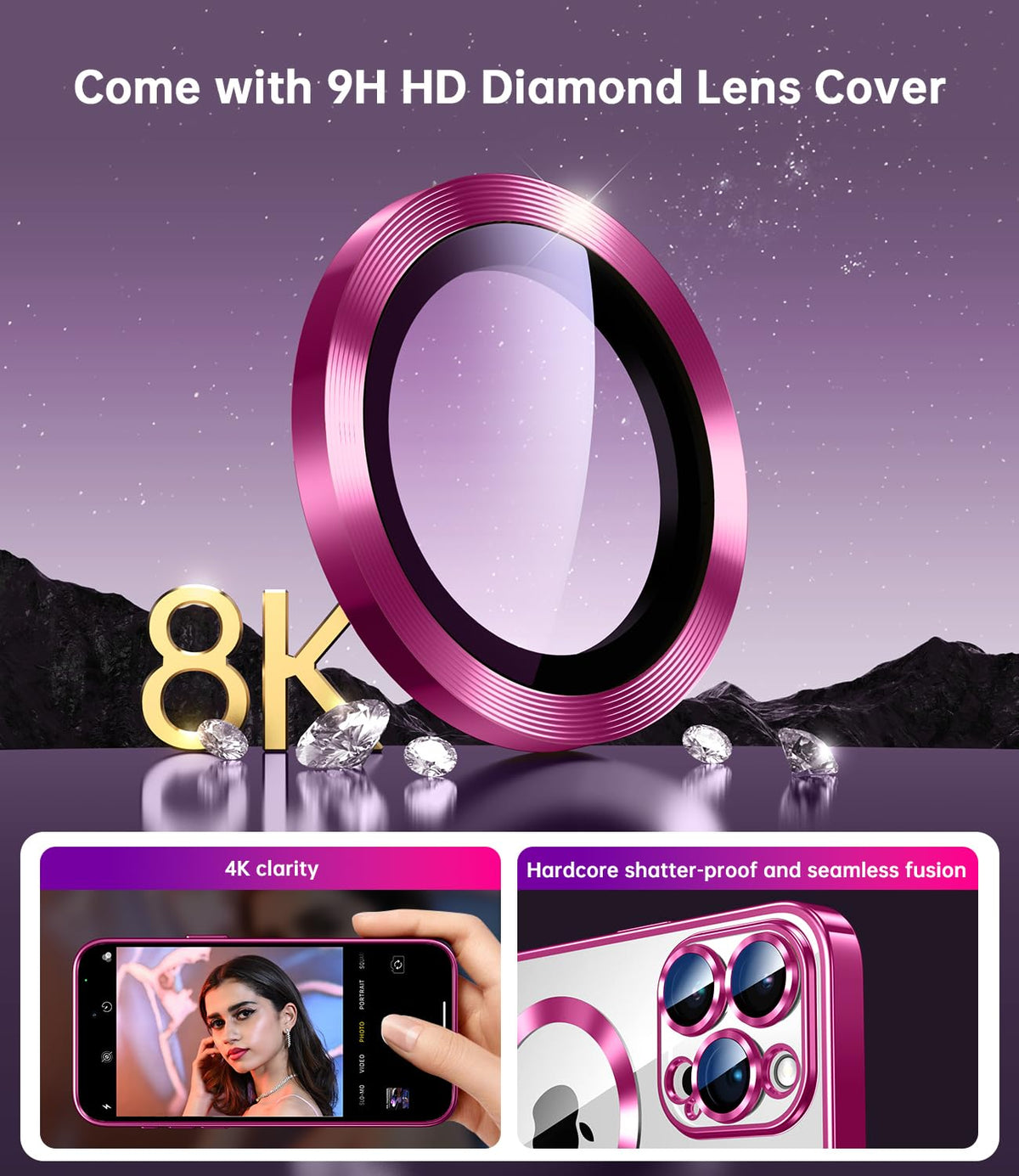 Waldeng For Iphone 15 Pro Max Case With Integrated Camera Lens Protection, [Seamless Work With Magsafe] [Metallic Glossy Soft Bumper], Diamond Clear Stylish Case For Iphone 15 Pro Max, Barbie Pink