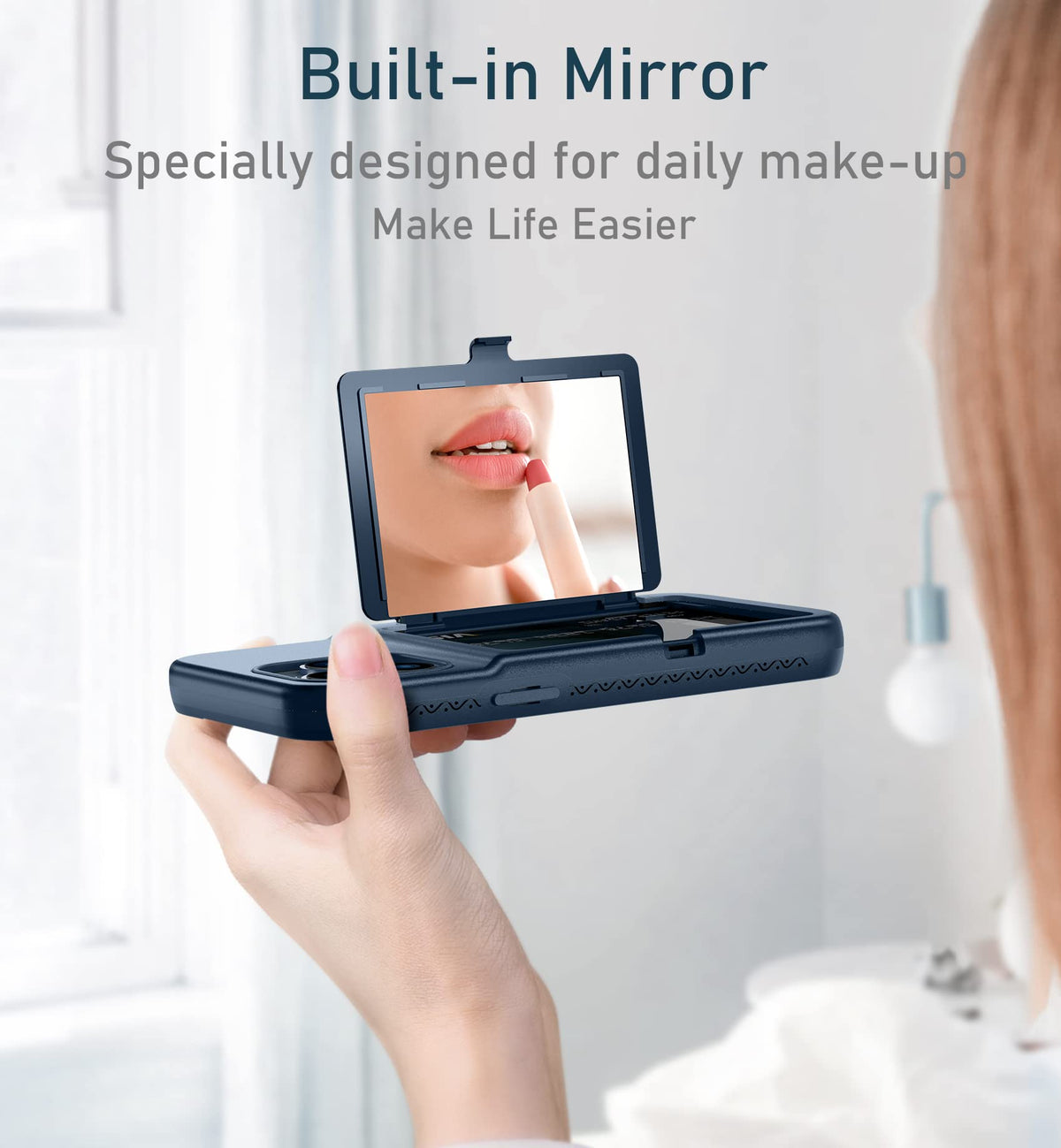 Q: Does the case provide any additional features for daily use?A: Yes, this case includes a hidden mirror for makeup touch-ups and a kickstand feature that allows you to prop your phone at a convenient angle for movie-watching or video-chatting.