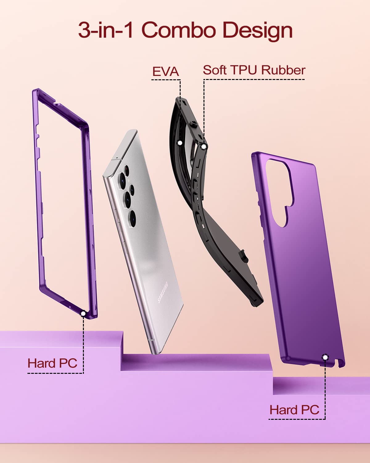 Q: How does the 3-layer design enhance protection for my Samsung Galaxy S22 Ultra?A: The 3-layer hybrid design includes advanced shock absorption and high impact defense, which effectively guards your device against drops, dirt, scrapes, and bumps.