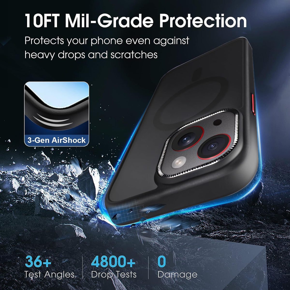 Q: What level of drop protection does this case provide?A: This case offers 10FT military-grade drop protection, effectively dispersing impact from drops and safeguarding your iPhone 15 from all directions with its TPU cushioning structure and polycarbonate back.