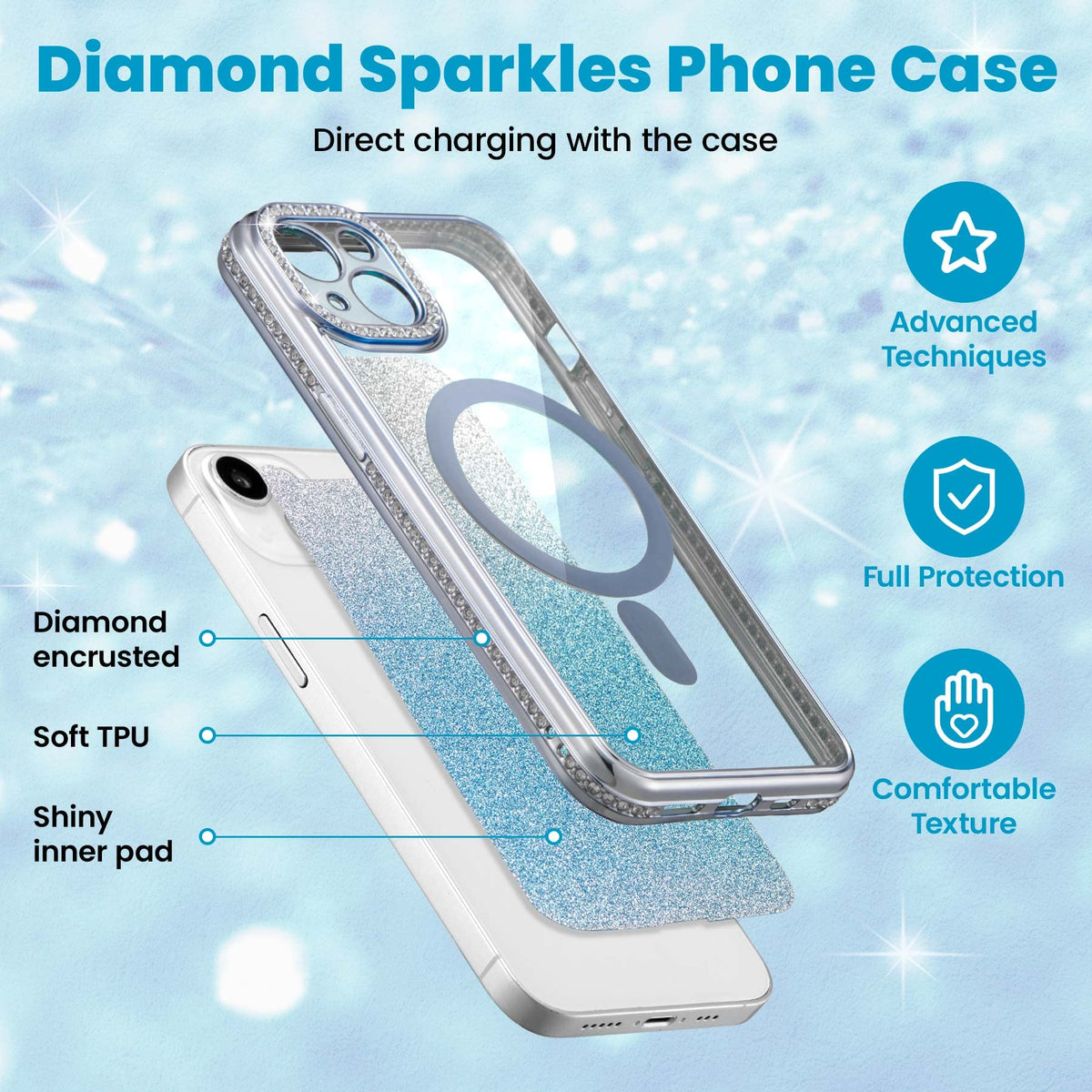 Zcdaye Case For Iphone 14 With Diamond Decorated, Iphone 14 Phone Case Compatible With Wirless Charging, Blue Edge Electroplated