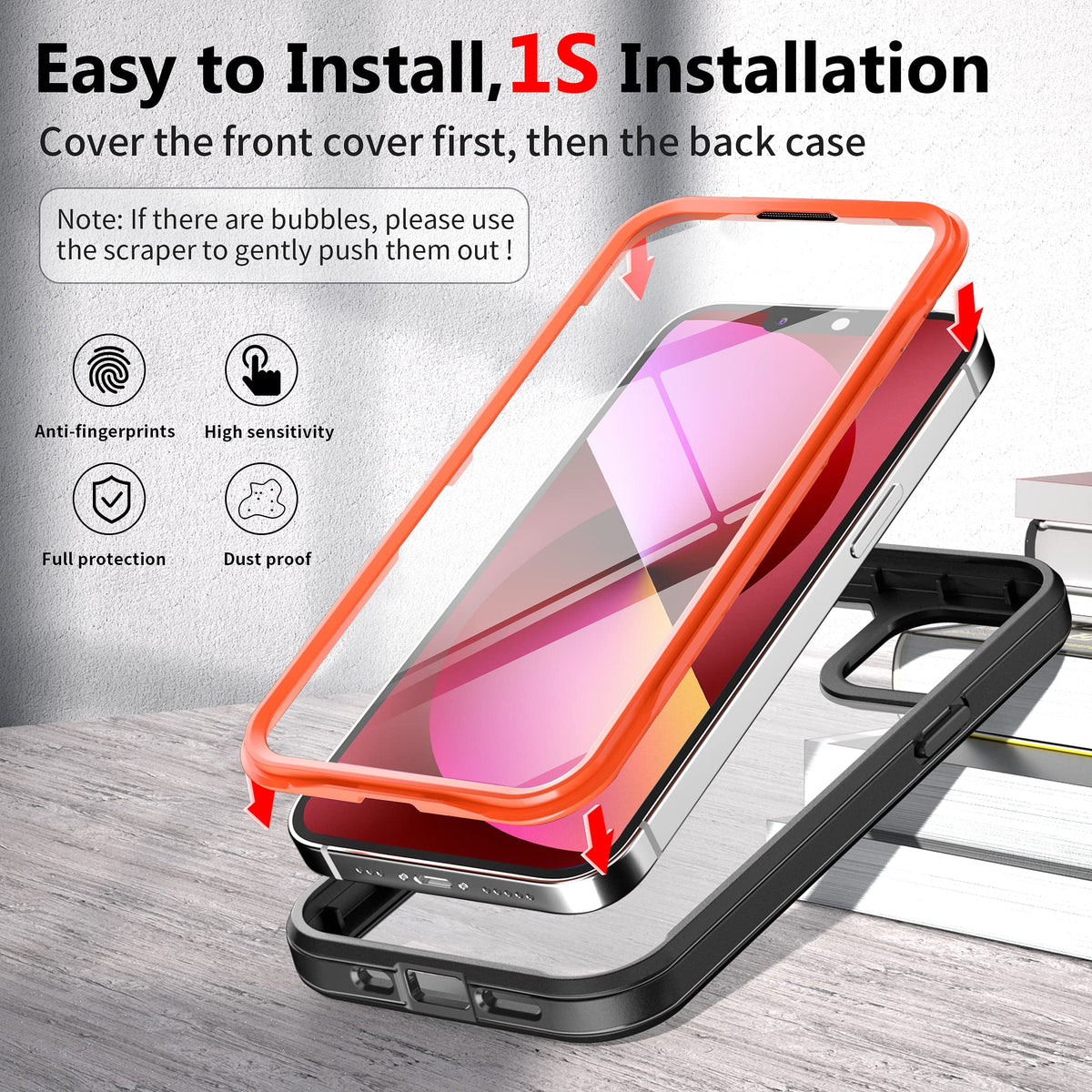 Q: How do I install the ZQE case and screen protector?A: To install, first, press your iPhone 13 into the front cover of the case. Ensure there are no bubbles between the screen protector and your phone. Next, attach the back case securely for full protection.