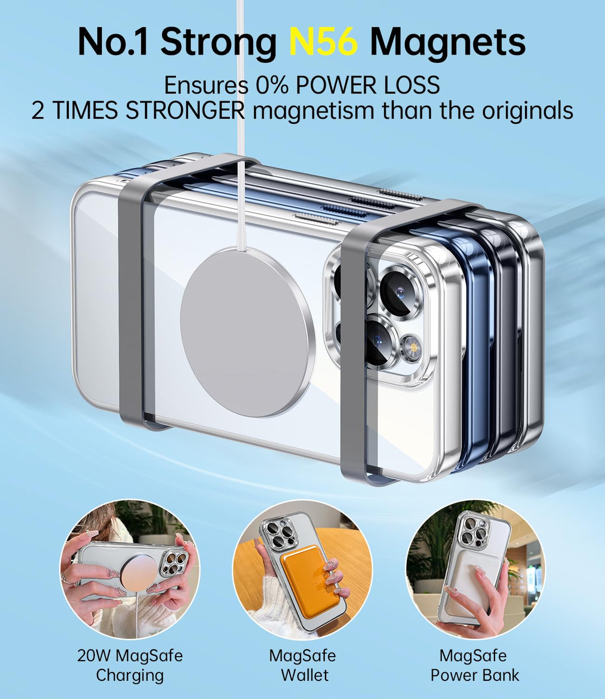 Q: How does the magnet strength compare to other cases?A: The JUESHITUO case is equipped with 48pcs N56 magnets, providing 3x stronger magnetism than many other cases, ensuring stability during wireless charging and usage with MagSafe accessories.