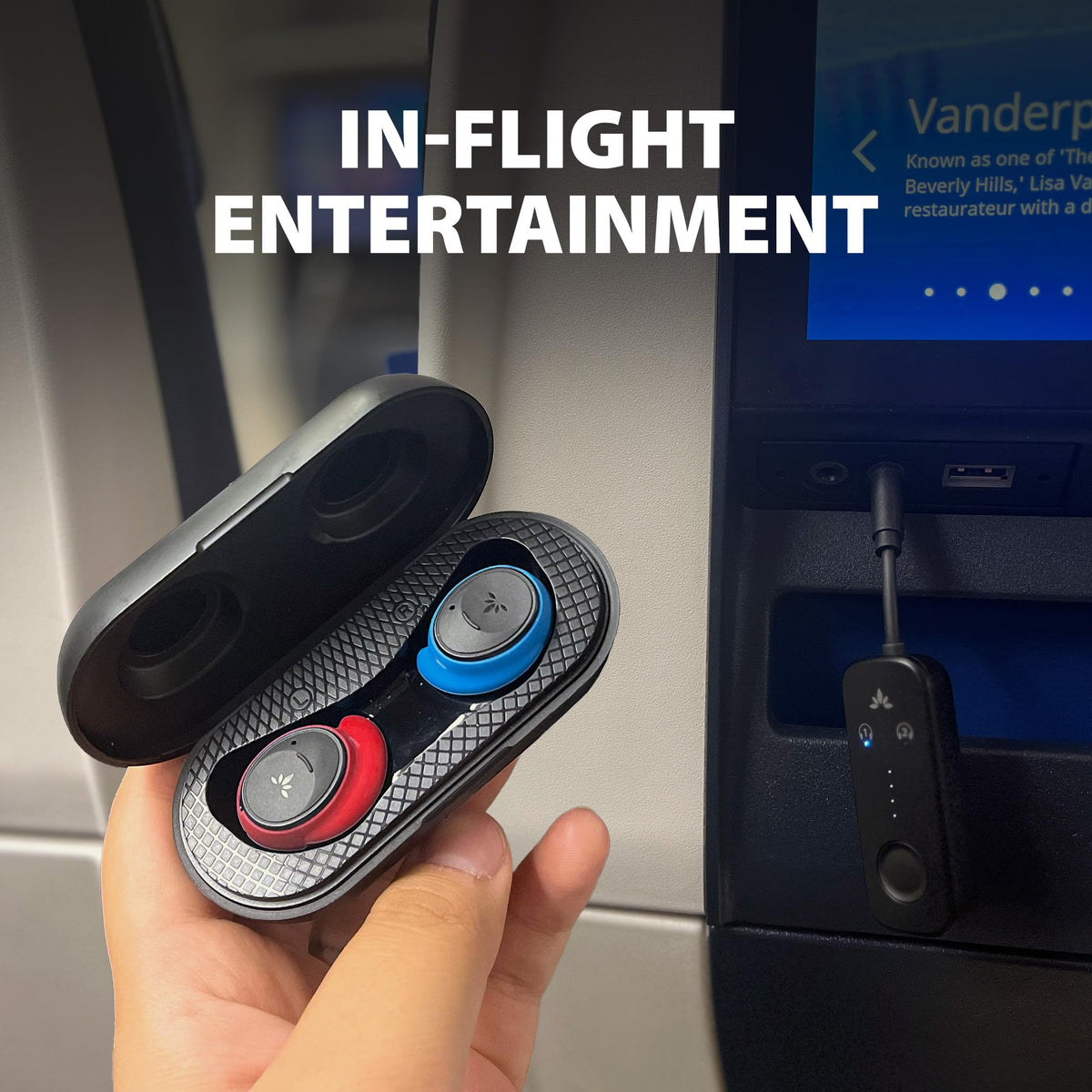 [Plug & Play] Easily Connect To Inflight Entertainment And Wirelessly Enjoy Movies Or Music With Our Bluetooth Wireless Transmitter And Earbuds. It Also Works With Any Audio Devices With An Aux Port, Such As Nintendo, Ps5, Gym Equipment, And Computers. No Pairing Required. | [Versatile Usage] You Can Use The Transmitter And Earbuds Separately. Equipped With Four Of The Latest Cvc 8.0 Environmental Noise-Canceling Microphones, These Bluetooth Earbuds Are Perfect For Making Crystal-Clear Calls In Any Environment With Iphones, Samsung Devices, And Computers. | [Noise Isolation] The Earbuds Are Ergonomically Designed To Fit In Your Ears And Come With Different Tips And Fins To Find The Perfect Fit, Creating A Seal That Blocks Outside Noises. This Makes Them Ideal For Planes, Airports, Or Any Other Noisy Areas. | [Secure & Comfortable] Stay Worry-Free During Flights And Workouts With These Secure Wireless Earbuds. Their Red And Blue Fins Make Them Easy To Put On And Find, While The Flat Design Ensures Comfortable Sleep On Any Side. | [Premium Sound] Featuring Aptx Adaptive And Precision Drivers With An Optimized Audio Seal, The Sky Ace Provides A Well-Balanced, Full-Spectrum Sound Experience. Aptx-Adaptive Codec Support Allows For High-Quality Audio And Low Latency, Providing An Immersive Listening Experience.