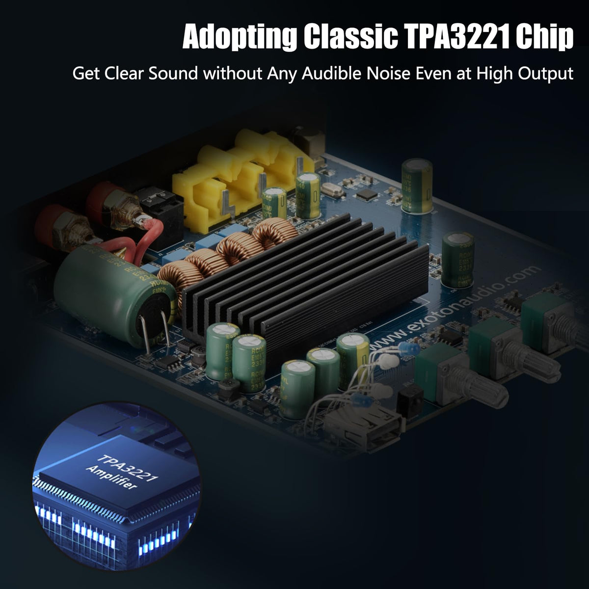 Q: What are the key features of the EXOTON Bluetooth 5.0 Stereo Audio Amplifier?A: The EXOTON Bluetooth 5.0 Stereo Audio Amplifier features a highly efficient Class D design, supporting a power output of 100W x 2. It includes advanced bass and treble controls for customized sound tuning and is equipped with the Texas Instruments TPA3221 chip for enhanced audio quality. This amplifier is compatible with a variety of audio sources including computers, TVs, and CD players.