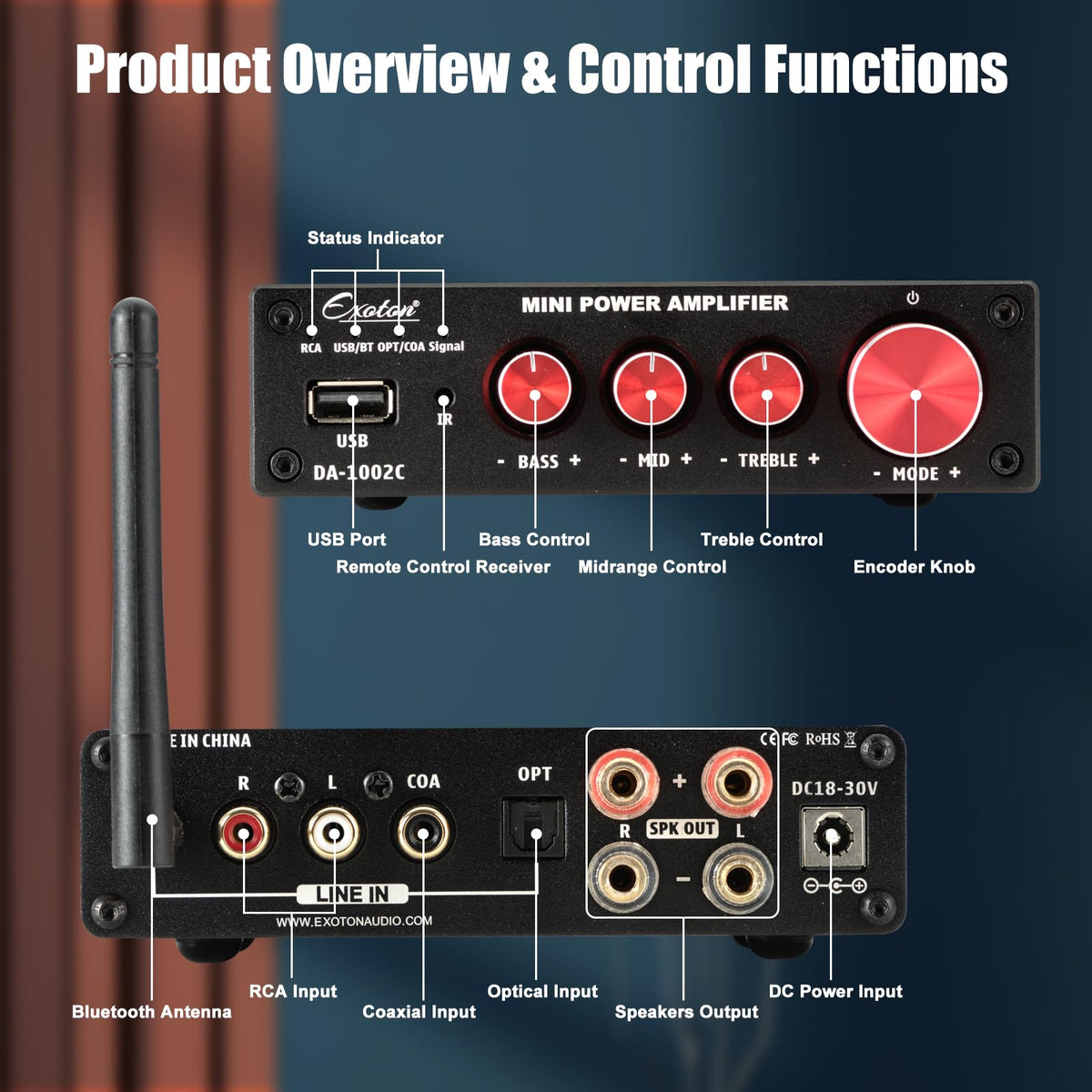 Exoton Bluetooth 5.0 Stereo Audio 2 Channel Power Amplifier Receiver, Mini Hi Fi Class D Integrated Amp 2.0 Ch For Passive Speak
