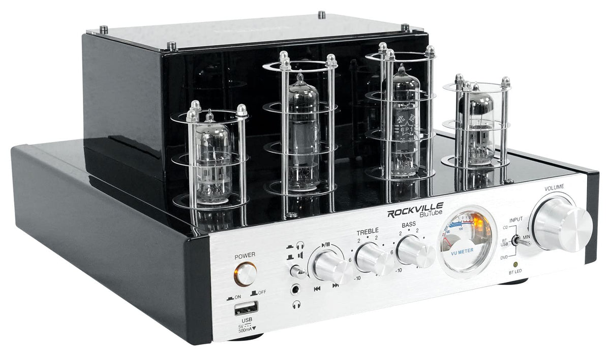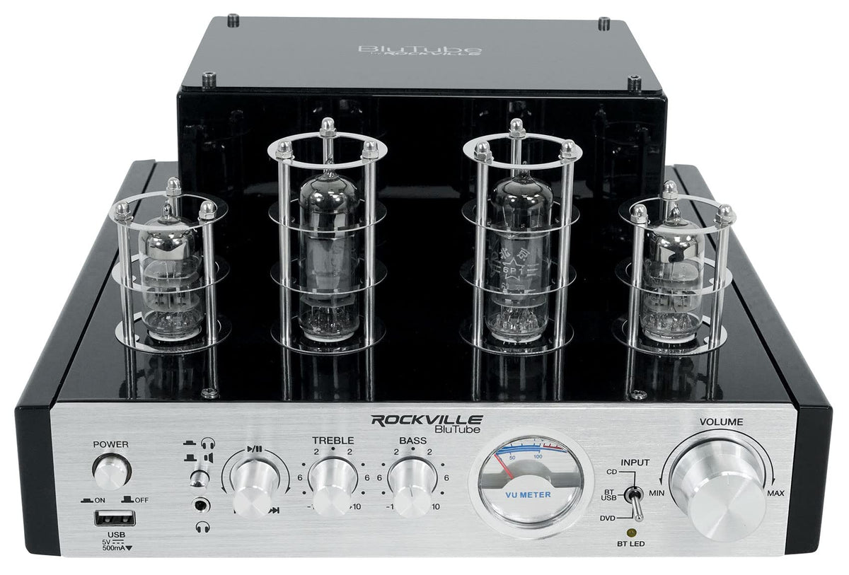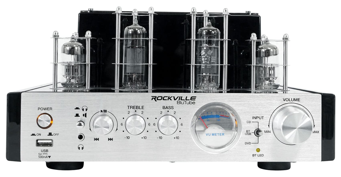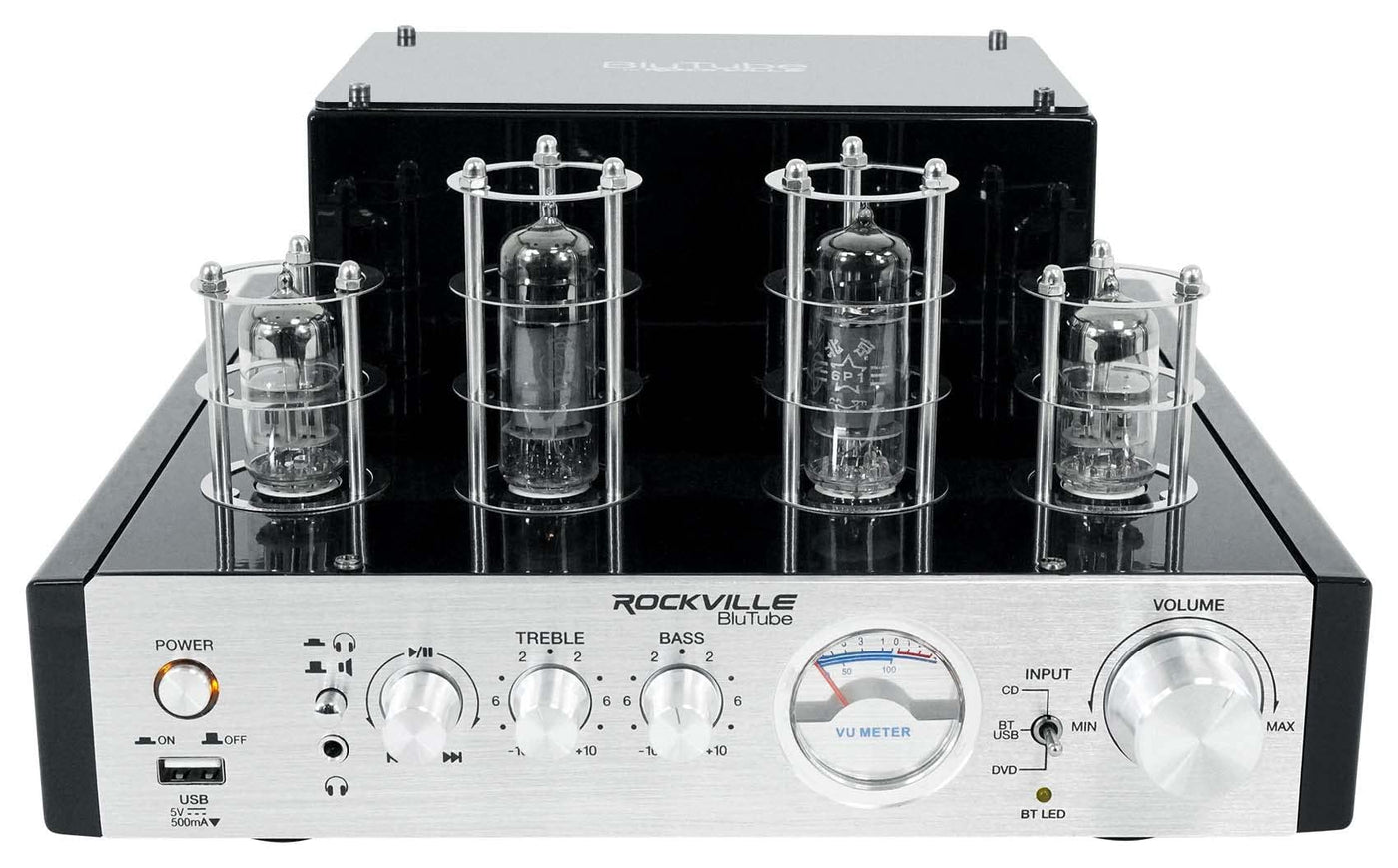 Includes: Tube Amplifier / Receiver. 5 Foot Tiffany Rca To 3.5Mm Cable. 5.5 Foot Power Cable. Owners Manual / Warranty Card. Features: Rockville Blutube Audiophile Grade Tube Amplifier With Bluetooth. 25 Watts X 2 Rms @ 8 Ohm. 35 Watts X 2 Rms @ 4 Ohm. Tube Amps Do Not Hard-Clip Even At High Volumes And Are Extremely Efficient. Due To This The Amp Sounds More Like Double The Rated Power!. Built In Bluetooth With 33 Foot Range. Built-In Preamplifier. (2) Sets Of Tiffany Rca Inputs To Connect To Any Audio Device Like A Tv, Laptop, Or Mp3 Player, Etc. Headphone Output. Vu Meter. Adjustable Bass And Treble (2 Band Equalizer). Usb Input For Music Files From Usb Thumb Drive. Usb Can Charge Your Phone Or Other Usb Device. Rear Speaker Terminals: Banana Plug / Binding Post Outputs For 2 Speakers. Frequency Response (3Db): 25Hz-20Khz. Input Impedance: 47Ko. Input Sensitivity: 300Mv. Output Impendence: 4-8Ohm. Total Harmonic Distortion(Thd): =0.02%. Signal-To-Noise Ratio(S/N): =86Db. Bluetooth: 2.1+Edr. Usb : Supports Wav/Mp3/Wma/Ape/Flac. 110V Power Supply. Unit Weight: 6.6 Lbs. Unit Dimension: 10.6X10.2X5.1