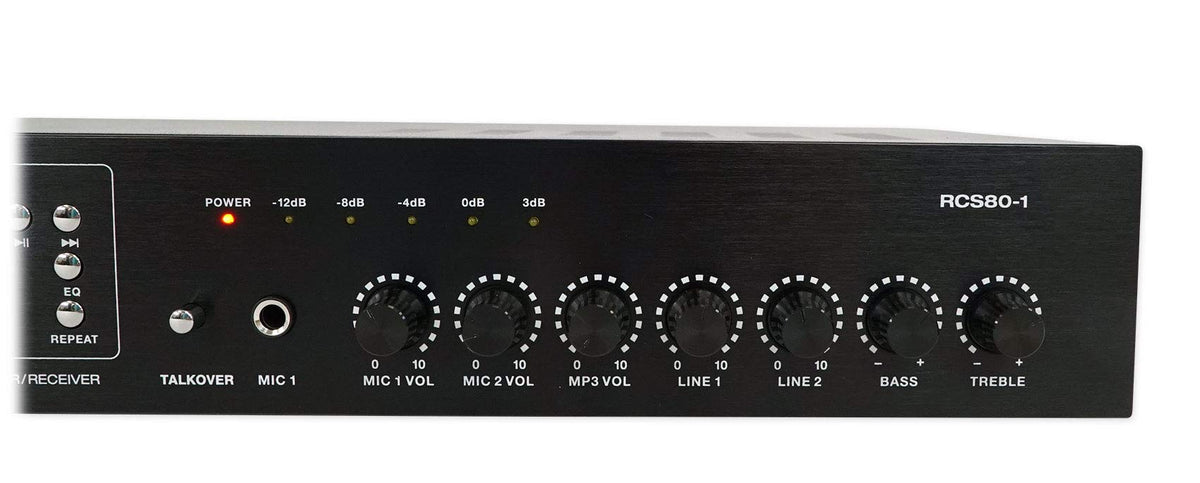 Features Of Rcs80-1: Separate Volume Control For Mic1, Mic2, Mp3, Line1, Line 2 Input. Bass And Treble Control. 5 Segments Signal Level Indication. Built In Cooling System Keeps Component Cool At All Times. Inputs And Outputs: (2) Sets Rca Aux Inputs. (2) Mic Inputs. Rca Rec Output. 100V Speaker Red Positive Speaker Output Terminal. 70V Speaker Red Positive Speaker Output Terminal. 8 Ohm Red Positive Speaker Output Terminal. Shared Negative Speaker Output Terminal.
