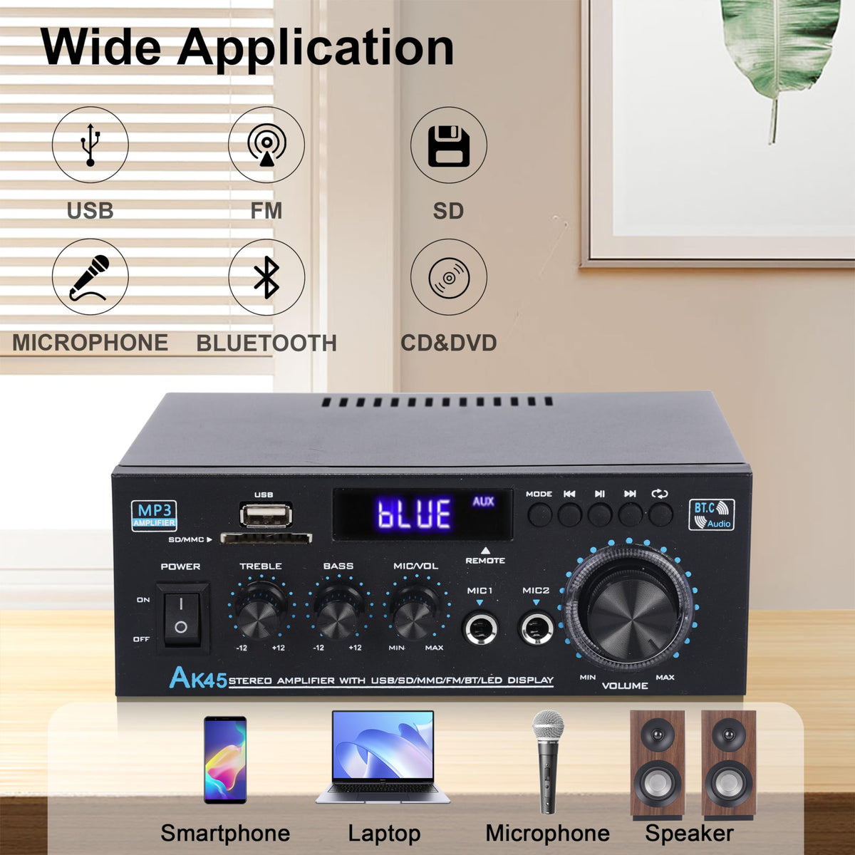 Stereo Receiver & Amplifier Home Audio Amp, Ak45 Bluetooth Receiver For Home Stereo, 300Wx2, Bluetooth 5.0, 2 Channel, W/Fm & Karaoke, W/Usb/Sd/Rca/Mic/Fm In, W/Remote, For Garage Party Market