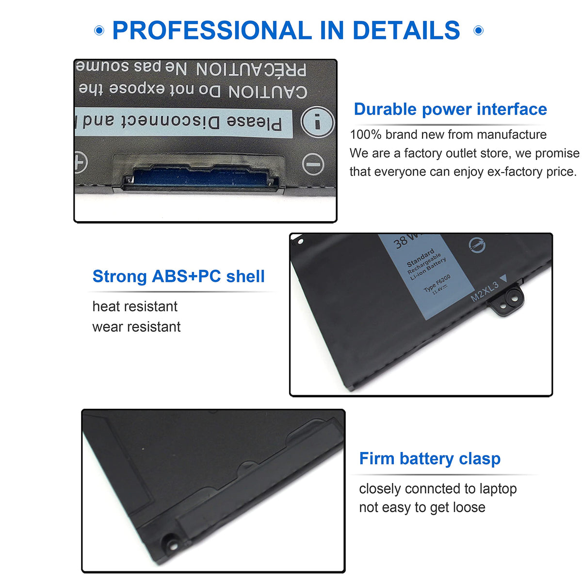 Q: What is the capacity and voltage of the F62G0 Battery?A: The F62G0 Battery has a capacity of 38Wh and operates at a voltage of 11.4V. It is designed to provide reliable power for your Dell laptops.