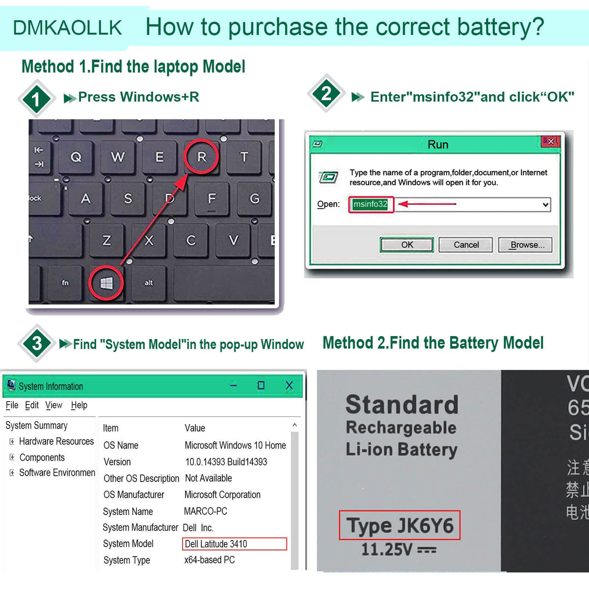 Q: What laptops are compatible with the 40Wh JK6Y6 battery?A: The 40Wh JK6Y6 battery is compatible with various Dell models, including Latitude 3410 and 3510 series, Vostro 5300, 5401, 5402, and 5501 series, as well as Inspiron 5300, 5400, and 7500 2-in-1 models. It is important to check your original battery's part number and shape to ensure compatibility.
