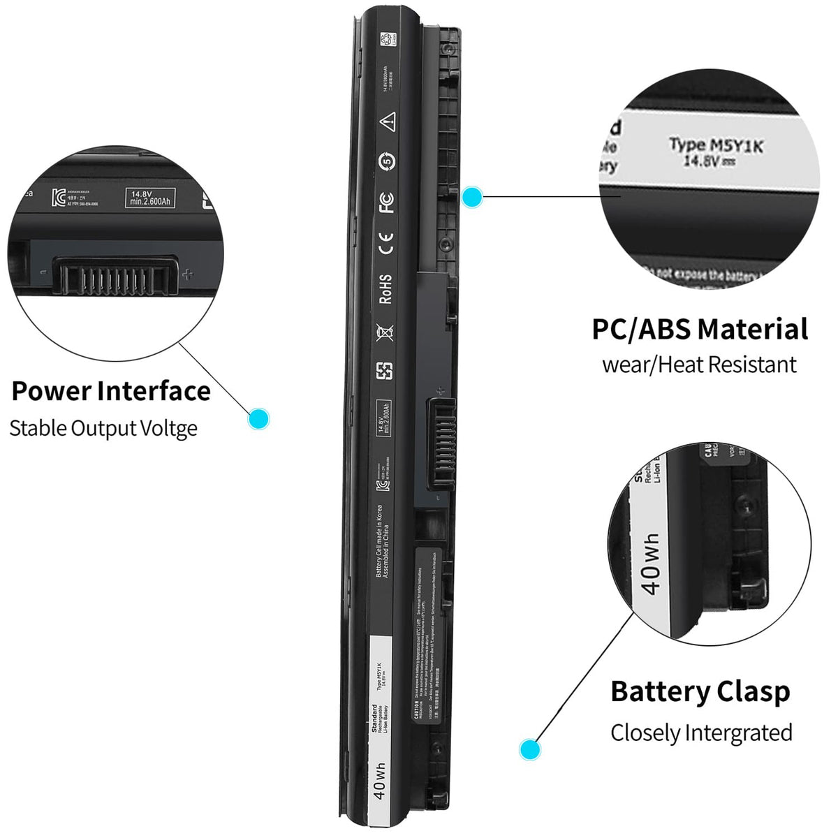 Q: What specifications should I know about the M5Y1K battery?A: The M5Y1K battery is a Lithium-ion type with a voltage of 14.8V and a capacity of 40Wh. It features 4 cells and is brand new. The battery is also certified by CE, FCC, and RoHS for safety.