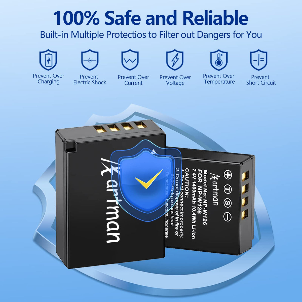 Q: What safety features does the Artman NP-W126S battery offer?A: The Artman NP-W126S battery includes a built-in smart chip that provides multiple safety protections including overcharge, overcurrent, overvoltage, short circuit, and high-temperature protection, along with a fireproof structure to enhance safety during use.
