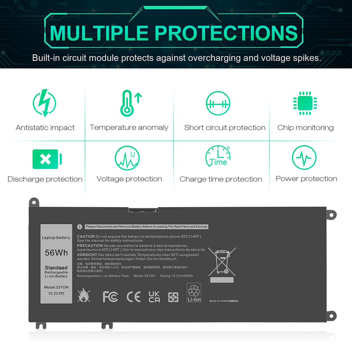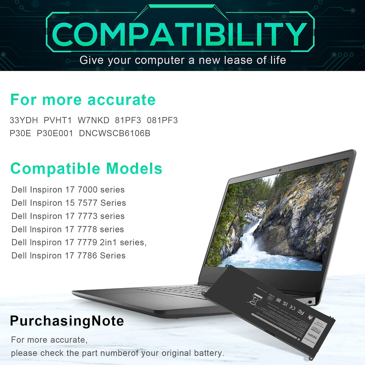Specification: Battery Type: Li-Ion Voltage:15.2V Capacity:56Wh Cell:3 Cells Recharge Cycles: 500 Operation Time: Around 1.5-3Hours Replace Part Number 33Ydh W7Nkd Pvht1 81Pf3 081Pf3 P30E P30E001 451-Bcdm Dncwscb6106B Compatible Models Dell Inspiron 17 7000 7577 7773 7778 7786 7779 2In1 Series Dell G3 15 3579 Series Dell G3 17 3779 Series Dell G5 15 5587 Series Dell G7 15 7588 Series Dell Latitude 15 3590 3580 Series Dell Latitude 14 3490 Series Dell Vostro 15 7580 7570 Series Dell Inspiron 7586 2-In-1 Series Dell Latitude 13 3000 3380 Series Dell Latitude 3480 Series Dell Latitude 3400 Series Dell Latitude 3500 Series ?Note?The 33Ydh Battery It Only Compatible With Dell ''Latitude'' 13 3380 Laptop,It Is Not Compatible With Dell ''Chromebook'' 13 3380 Laptop.