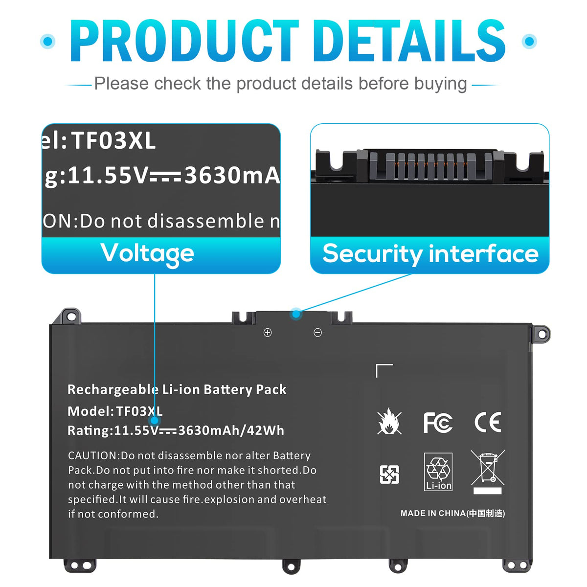 Specification Battery Type: Li-Ion Voltage: 11.55V Capacity: 42Wh Cell: 3 Cells Recharge Cycles: Up To 500 Operation Time: Around 1.5-2.5Hours Compatible Models: Hp Pavilion 15-Cc000No 15-Cc001Na 15-Cc001Nf 15-Cc001Ng 15-Cc001Ni 15-Cc001Nia 15-Cc001Nk 15-Cd000Ng 15-Cd000Nu 15-Cd000Nv 15-Cd000Ur 15-Cd001Au 15-Cd001Ca 15-Cd001Ds 15-Cd001Ng 15-Cd001Nl 17-Ar007Ca 17-Ar050Wm And More. Replacement P/N: Tf03Xl, Tf03041Xl, 920046-121, 920046-421, 920046-541, 920070-855, Hstnn-Ib7Y, Hstnn-Lb7J, Hstnn-Lb7L, Hstnn-Lb7X, Hstnn-Ub7J, Tpn-Q188, Tpn-Q189, Tpn-Q190, Tpn-Q191, Tpn-Q192, Tpn-Q196. Note: Please Make Sure This Battery Suit For Your Laptop Before Place The Order.