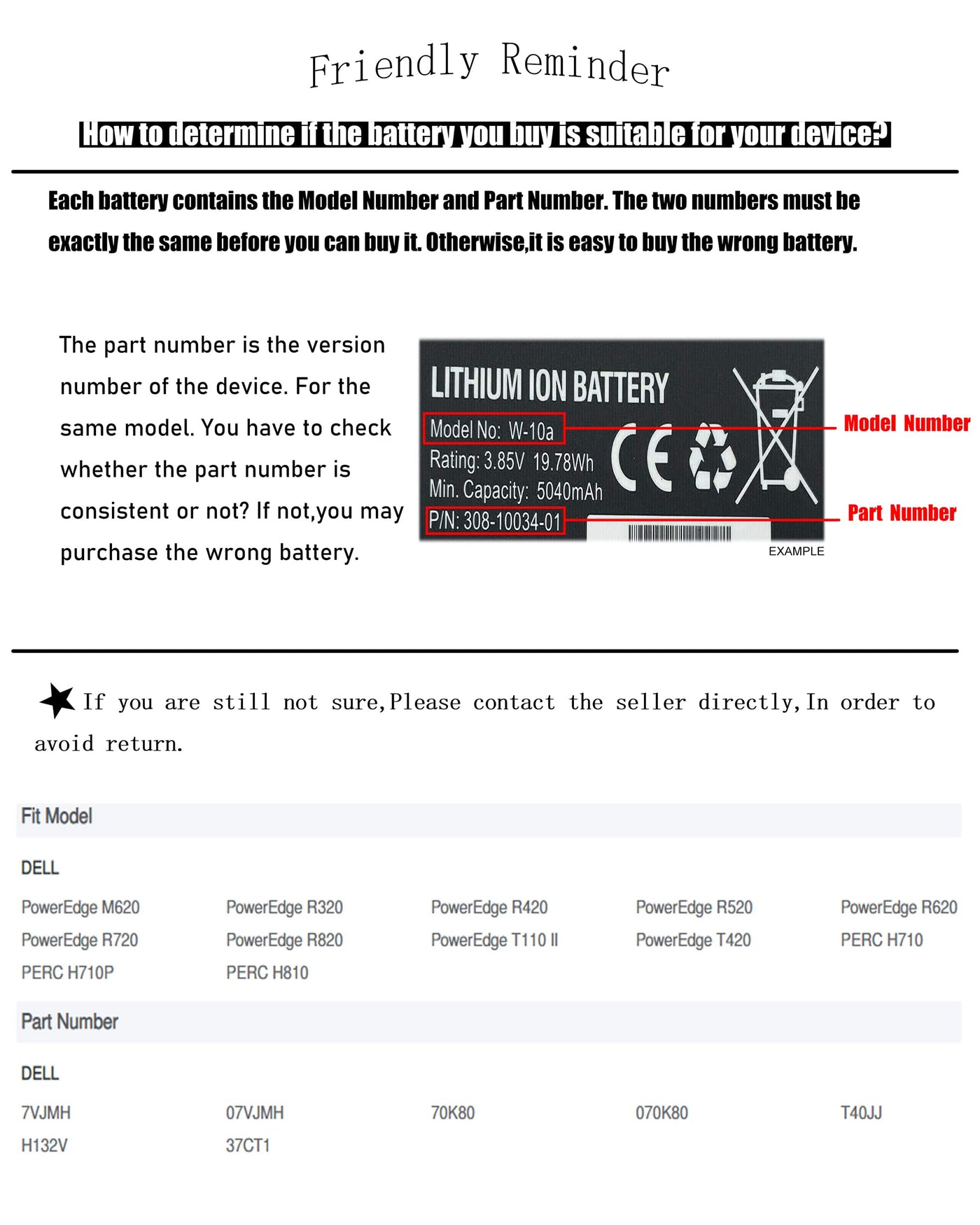 - Compatible Model:Dell Perc H710Dell Perc H710Pdell Perc H810Dell Poweredge M620Dell Poweredge R320Dell Poweredge R420Dell Poweredge R520Dell Poweredge R620Deltips Before Purchaseplease Confirm The Compatible Model And Battery Part Number Carefully Before You Purchase It. If You Are Not Sure, Please Send Email To Us With Your Battery Details Or Pictures, We Will Give You Professional Suggestions.