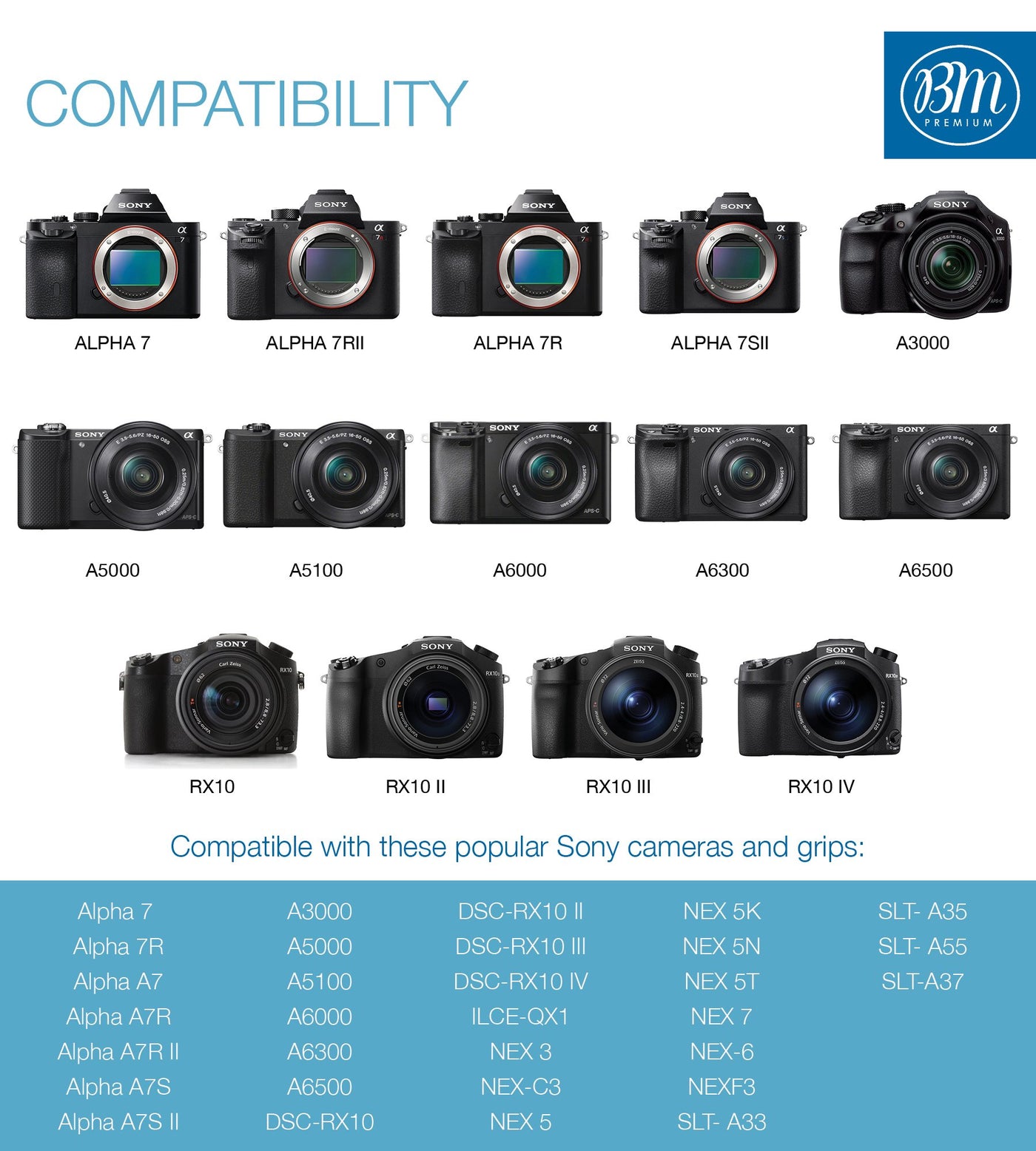 Compatible with the following cameras: Lumix DMC-3D1 Alpha 7 Alpha a7 Alpha 7R Alpha a7R Alpha a7R II Alpha a7S Alpha a7S II Alpha a3000 Alpha a5000 Alpha a6000 Alpha a6300 Alpha a6400 Alpha a6500 NEX-3 NEX-3N NEX-5 NEX-5N NEX-5R NEX-5T NEX-6 NEX-7 NEX-C3 NEX-F3 SLT-A33 SLT-A35 SLT-A37 SLT-A55V ILCE-QX1 Cyber-shot DSC-RX10 Cyber-shot DSC-RX10 II Cyber-shot DSC-RX10 III