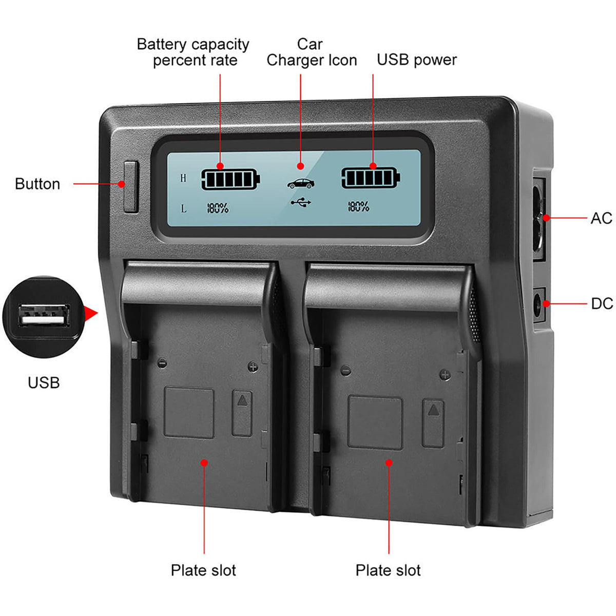 Q: Can I use the BM Premium Dual Bay Charger with other battery models?A: The BM Premium Dual Bay Charger is specifically designed for LP-E6NH batteries. While it is optimized for these models, it is recommended to use it exclusively with LP-E6NH batteries to ensure safety and efficient charging performance.