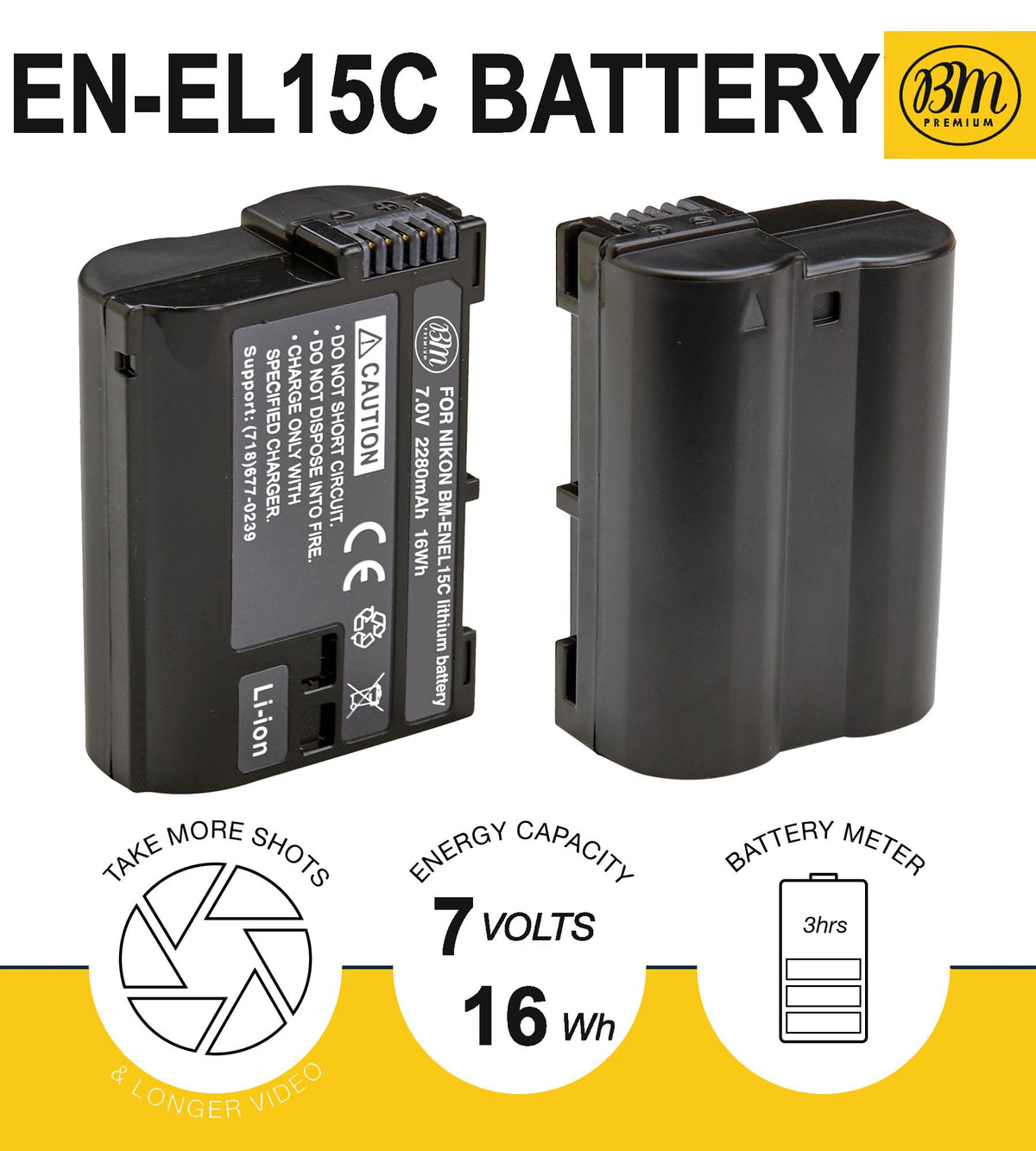 Quality And Durability For Your Camera: Bring Your Digital Camera Back To Life With A New Battery. Make Sure You Never Miss Another Once-In-A-Lifetime Moment By Having A New En-El15C Battery Specifically Designed For Your Nikon Digital Camera. Bm Premium Rechargeable Batteries Are Engineered To Meet Or Exceed Oem Specifications And Feature The Latest Battery Technology, Including Advanced Circuitry, Voltage Regulation, And Thermal Circuit Protection. Bm Premium Stands Behind Their Products. Battery Is Compatible With The Following Cameras And Grips: 1 V1 D500 D600, D610 D750, D780 D800, D810, D810A, D850 D7000, D7100, D7200, D7500 Z5, Z6, Z6 Ii, Z7, Z7 Ii, Z8, Zf Kit Includes: Qty 1 Bm Premium En-El15C Battery