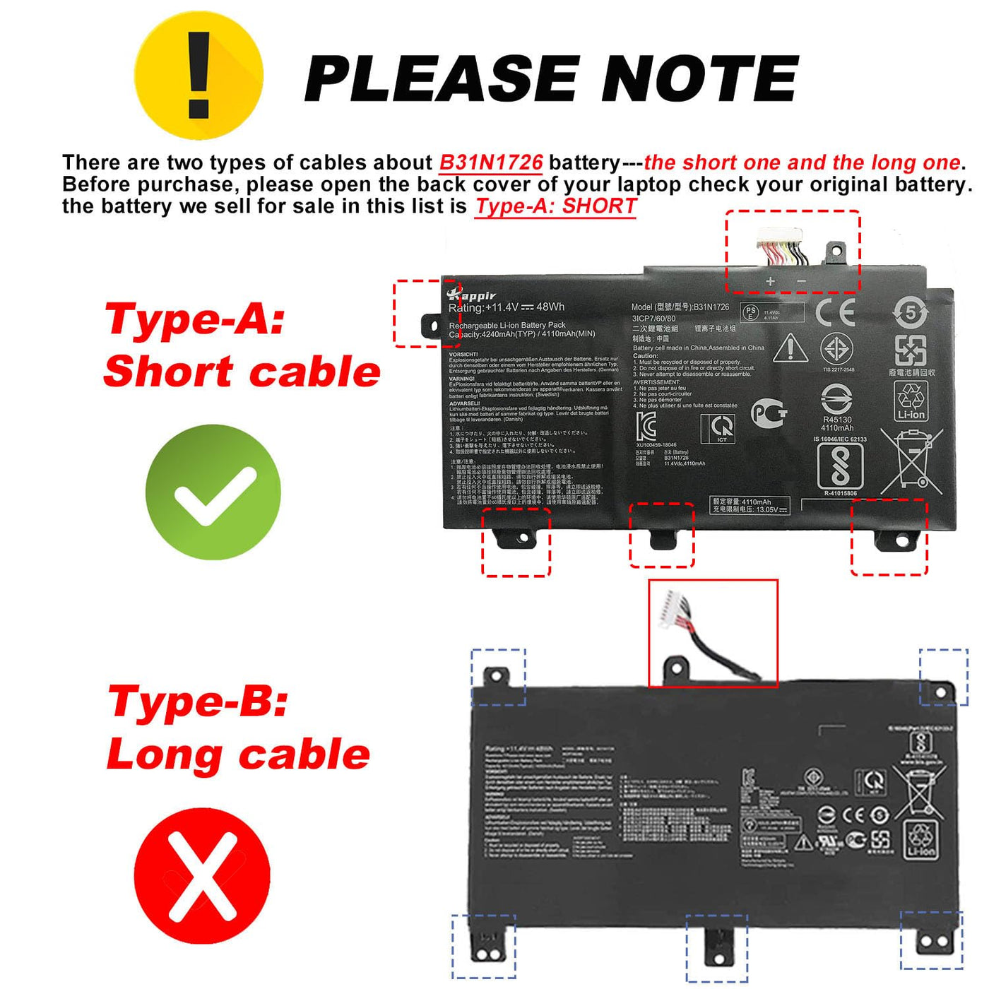 Welcome To Kappir: Dear Customers, Thank You For Your Interest And Support For Our Laptop Battery. We Are A Professional Laptop Battery Manufacturer, Dedicated To Manufacture And Provide Different Type High Quality Laptop Batteries For Our Customers. Thanks For Your Trust Again! Specification: Model:B31N1726 Battery Type: Li-Ion Voltage: 11.4V Capacity: 48Wh 4240Mah Location Of Connector And Cable Length: Please Refer To The Battery Picture And Compare With Your Original Battery Replacement Part Number: B31N1726 B31N1726-1 B31Bneh B31Bn91 A41Lk9H Compatible Models: (Use ''Ctrl+F To Find Your Model Quickly'') Asus Tuf Gaming A15 Fa506Iu Series Asus Tuf Gaming A17 Fa706Ii Series Asus Tuf Gaming Fx504Gd Fx504Ge Fx504Gm Series Asus Fx80 Fx80G Fx80Gd Fx80Ge Fx80Gm Fx86 Fx86Fe Fx86Fm Series Asus Tuf Gaming Fx505Dt Fx505Dv Fx505Du Fx505Dy Fx505Ge Fx505Gd Fx505Gm Series Note: For More Accurate, Please Check The Part Number Of Your Original Battery Packing Included: 1* B31N1726 Battery 1* Instruction Manual Warm Tips Before Purchase: Please Open Your Laptop Case, Check And Confirm Your Original Battery Model And Appearance, Compared With Our Battery Image, Make Sure That'S What You Need. Especially The Location Of The Connector And The Cable Length (Long Or Short) Battery Maintenance Method For Optimal Use: ? When You Get The New Battery, Discharge The Battery To 5% (Not 0%), Then Charge And Cycle 3-4 Times To Wake Up The New Battery ? The Important Point Is To Perform A Full Discharge And Charge Every Other Month To Extend The Battery Life ? Do Not Connect The Adapter For A Long Time While Using The Battery. It May Damage The Battery ? Avoid Artificial Shocks, Disassembly, Crush, Or Puncture. Do Not Dispose Of It In Fire Or Water